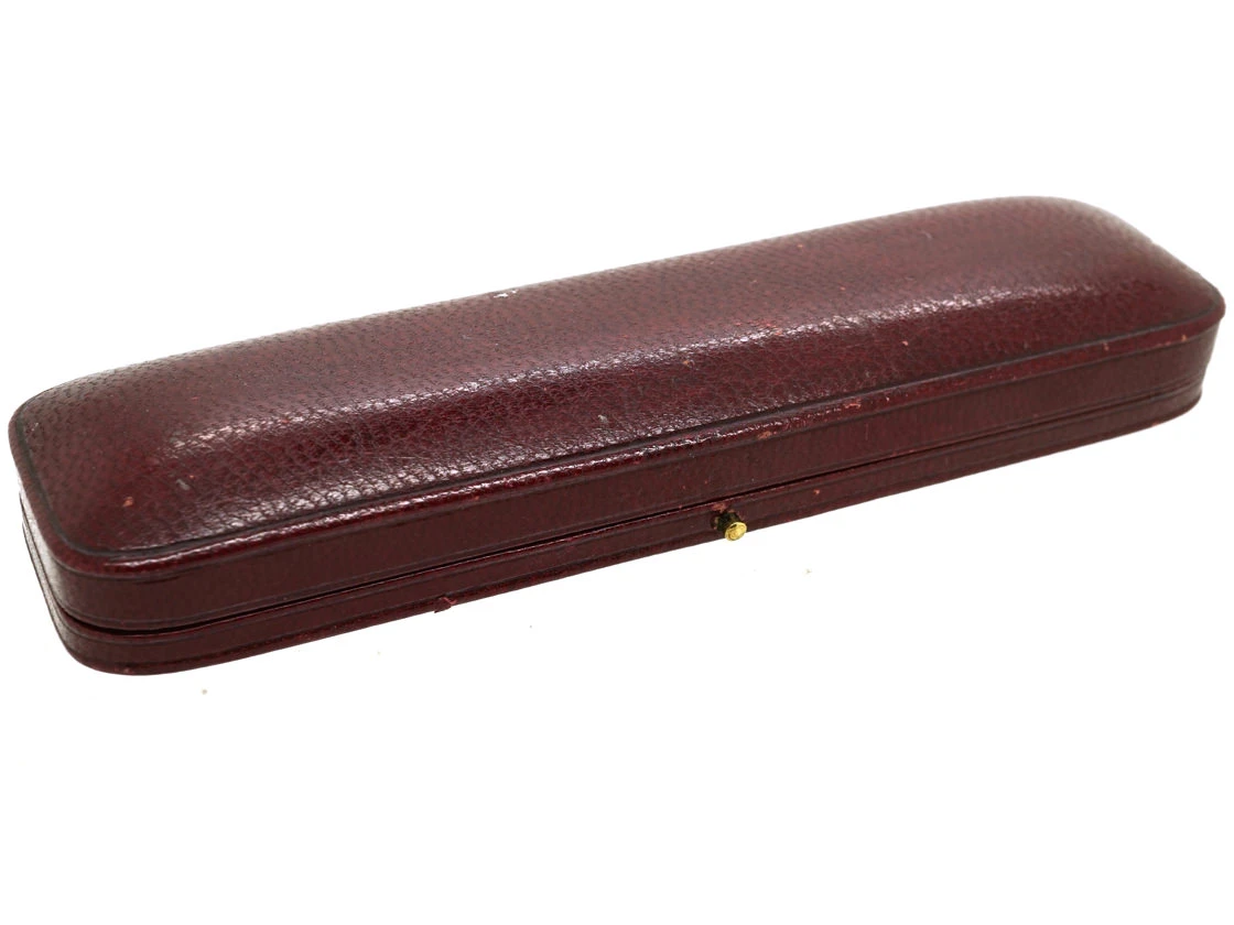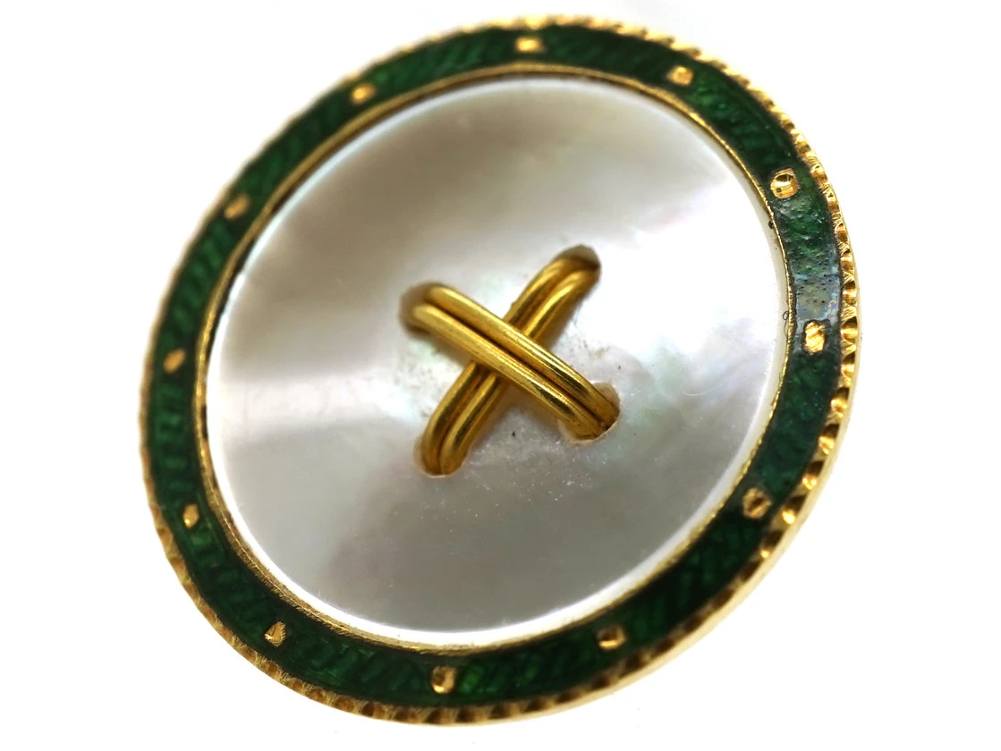 A good set of 18ct75% pure gold (or 750 parts pure gold and 250 parts other metals) gold dress values in their original case, retailed by the Goldsmiths and Silversmiths company circa 1900-1920. They have been enamelled in green enamelA pigmented glass-like material used in powdered form and fused onto the metal surface of a piece of jewellery. and have mother of pearlThe iridescent inner layer of certain molluscs such as oysters or abalones which is used as a decorative inlay. centres with a gold criss cross value motif.