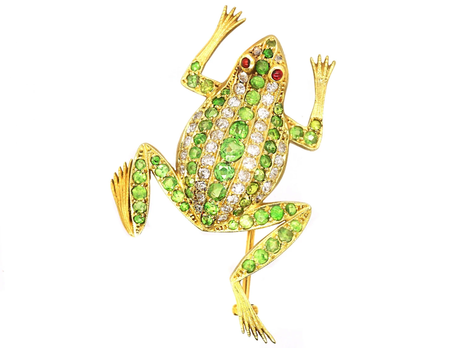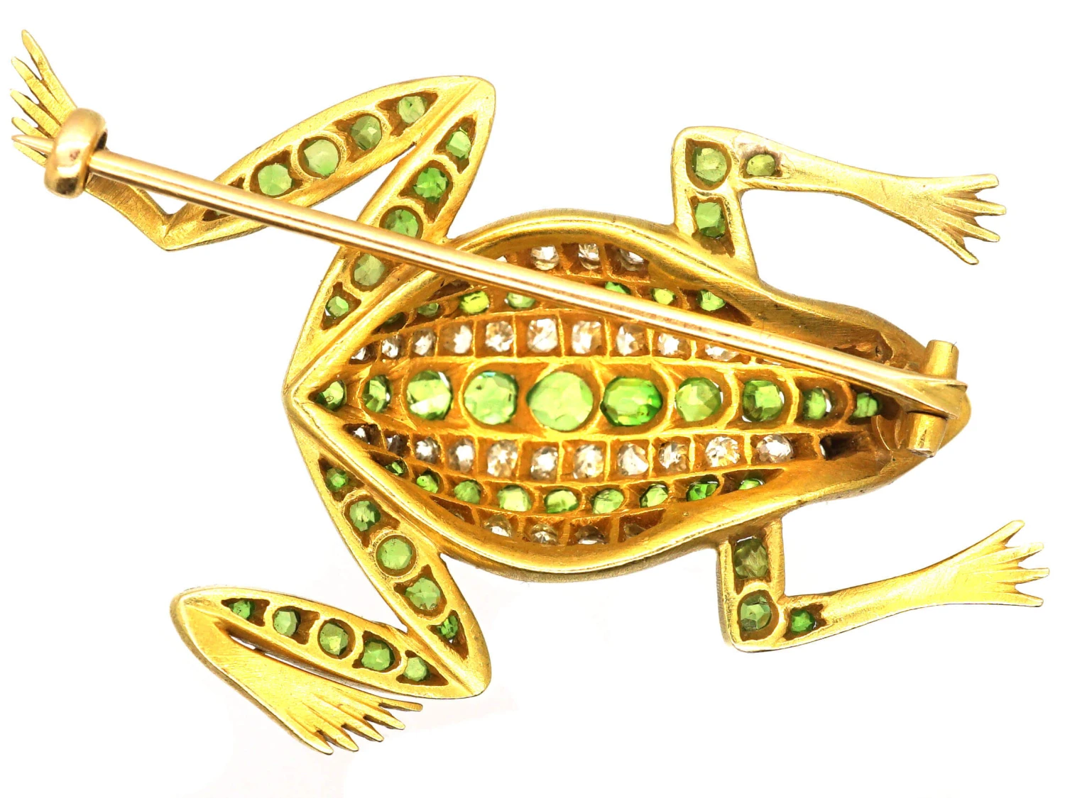 A fabulous large 18ct gold novelty brooch, as they were called, of a leaping frog. It was made circa 1910. His body has been set with lines of graduated green garnets or demantoid garnets which is the correct name for these stones. He has two rose diamonds near his mouth and cabochon garnet eyes. His body has been set with old mine cut diamonds in between the green garnets. Although garnets have been known since ancient times, the demantoid variety was not discovered until 1868 in Russia’s western central Ural Mountains. Miners were immediately stunned by the highly refractive nature of the gem material. They began comparing it to diamond and referred to it as “demantoid”, from the French “demant” meaning diamond. The reason is obvious, with its high brilliance and dispersion. These bright apple green stones are comparatively rare and very expensive as they are no longer mined. In the early 1900s they were a celebrated stone and many items of jewellery were set with these beautiful stones.