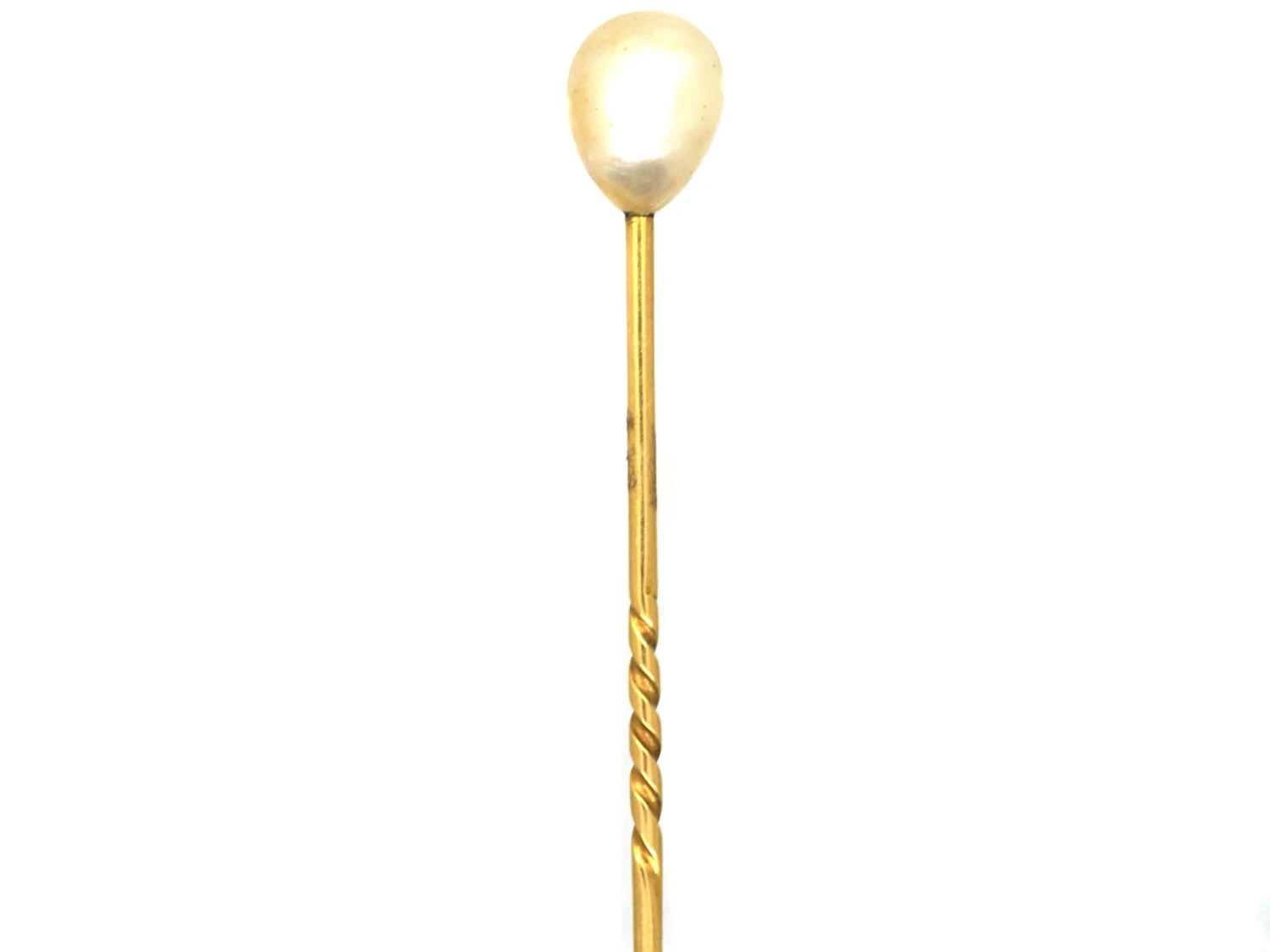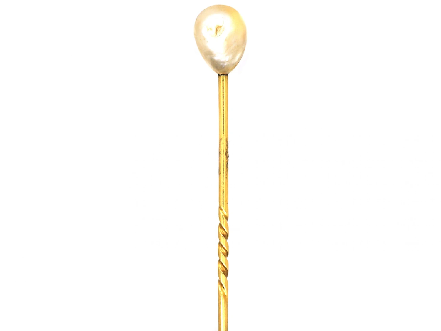 A stylish tie pin to wear that was made circa 1900-1910 and has been set with a large Baroque pear shaped pearlNatural pearls are an organic gem formed inside live mollusc shells and come in all shapes and sizes. They are formed as the result of a natural irritant within the mollusc’s mantle and as a defence, layers of iridescent nacre form over the top of it, creating a pearl. . The pin is 18ct75% pure gold (or 750 parts pure gold and 250 parts other metals) gold.