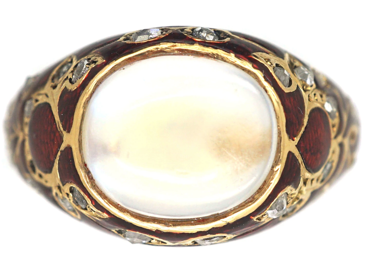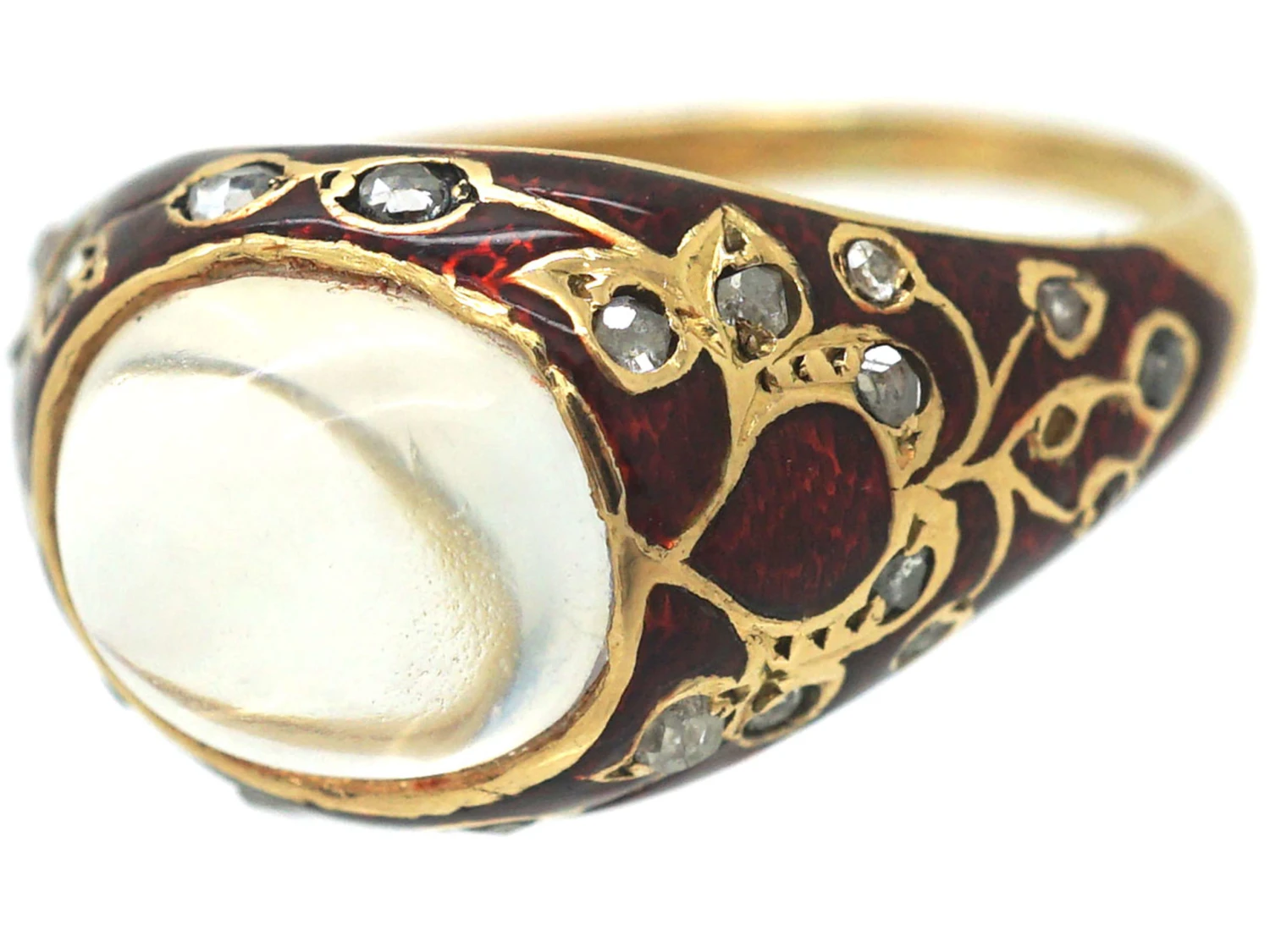 A very unusual 18ct75% pure gold (or 750 parts pure gold and 250 parts other metals) gold ring that has been enamelled in a strawberry red enamelA pigmented glass-like material used in powdered form and fused onto the metal surface of a piece of jewellery. with small rose diamonds. In the centre is a cabochonA polished, not faceted, dome shaped stone – either round or oval with a flat polished base, primarily used as a cut for phenomenal stones such as cat’s eyes and stars.