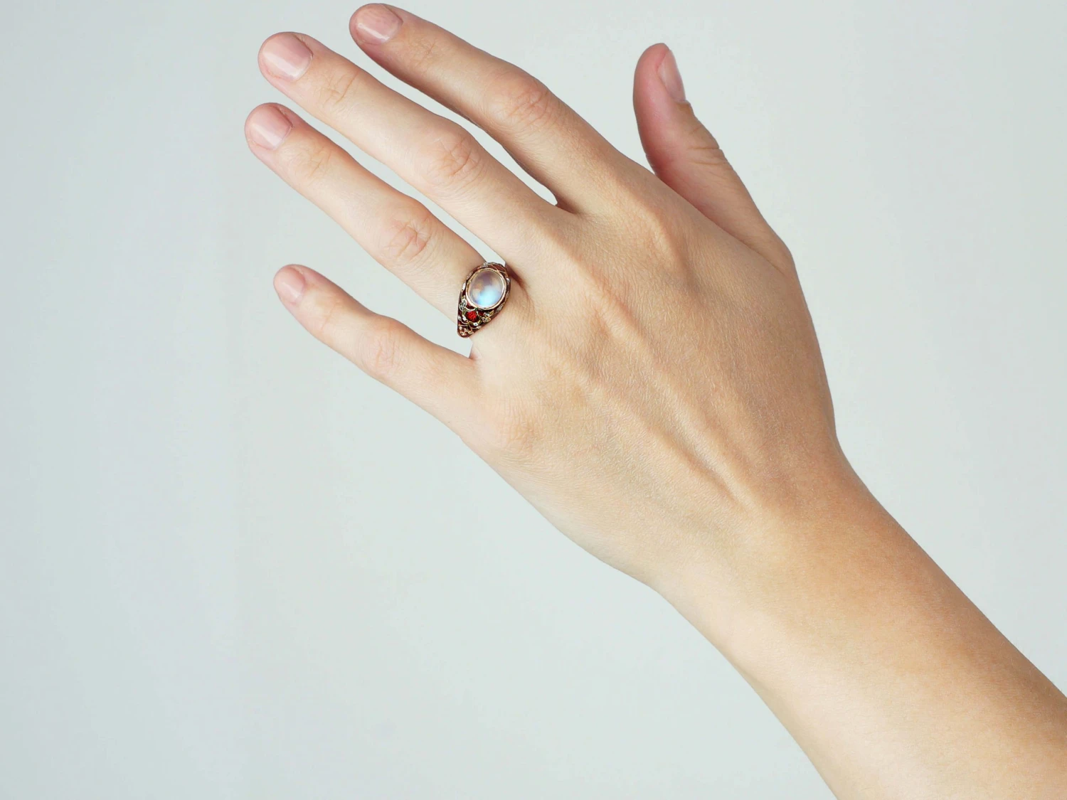 moonstoneMoonstone, the alluring pale gemstone, is known for its attractive pearly sheen and is so named for its resemblance to the moon. . With a silvery bluish light that seems to come from within, moonstone has many associations with the Moon. It has a long history of use as a talisman for fertility, love, protection, and travel. It is also associated with people born in may and also born on a monday “Moonday”. The red enamel further accentuates Love and the little twinkly diamonds are the Eternal stars. What a perfect ring to give to someone you love.