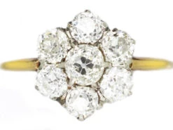 A pretty 18ct75% pure gold (or 750 parts pure gold and 250 parts other metals) gold diamondA precious, lustrous gemstone made of highly compressed carbon. Diamonds are one of the hardest materials known to mankind. Colours of diamonds range from colourless, yellow, orange and brown to almost black. Natural coloured (or ‘fancy’) diamonds can be extremely rare. The cut, colour, clarity and carat weight of a diamond are the criteria jewellers use… clusterA group of small diamonds or colourful gemstones grouped together to form a cluster, mimicking the look of a larger gem. Often this group can surround a larger center stone. ring that has been set with a slightly larger old mine cutAn 18th, 19th and early 20th century diamond shape, typically cushion or asymmetrical, marked by a small table, a high crown and a large culet. Culets are the small flat facets at the bottom of a stone which appear to the untrained eye as a hole in the middle of the stone. Before the advent of modern machinery which allows for the precise faceting we see tod… diamond in the centre with six smaller old mine cut diamonds around it. It is a daisy design that was very popular in the 1910-1920 period. The diamonds are good well matched white stones. It sits low on the finger so it is a practical ring to wear as an engagement ring