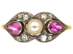 A very pretty 18ct75% pure gold (or 750 parts pure gold and 250 parts other metals) gold EdwardianJewellery made in the Edwardian era (1901-1914). ring in the Art NouveauA movement within the arts, particularly jewellery, evolving out of a response to mass production and the industrial revolution (1890-1915). Jewellery of this period was heavily influenced by nature and femininity, with its sweeping lines and organic motifs. style which was popular in the 1900s. It is set with two pink sapphires which are technically pale rubies, and a natural pearlA pearl-bearing mollusc that has not been tampered with by man to produce a cultivated pearl will produce a ‘natural pearl’. and small diamonds. The top is platinumDerives from the Spanish word ‘platina’ meaning ‘little silver’. Acknowledged since the 1900s, platinum’s durability and natural brightness has been and still is today highly treasured A metallic element prized for its rarity, whiteness, high tensile strength and insusceptibility to corrosion, platinum first became widely used in jewellery in the late ninete…. The whole effect is delicate and unusual.