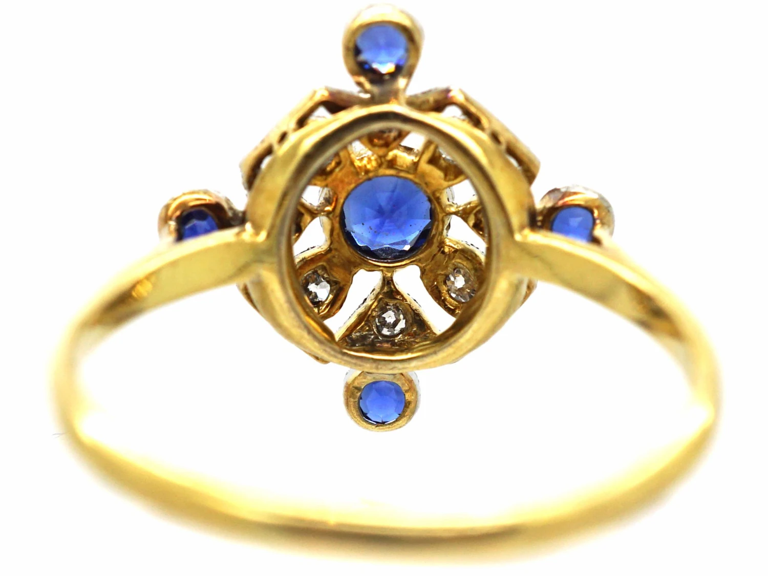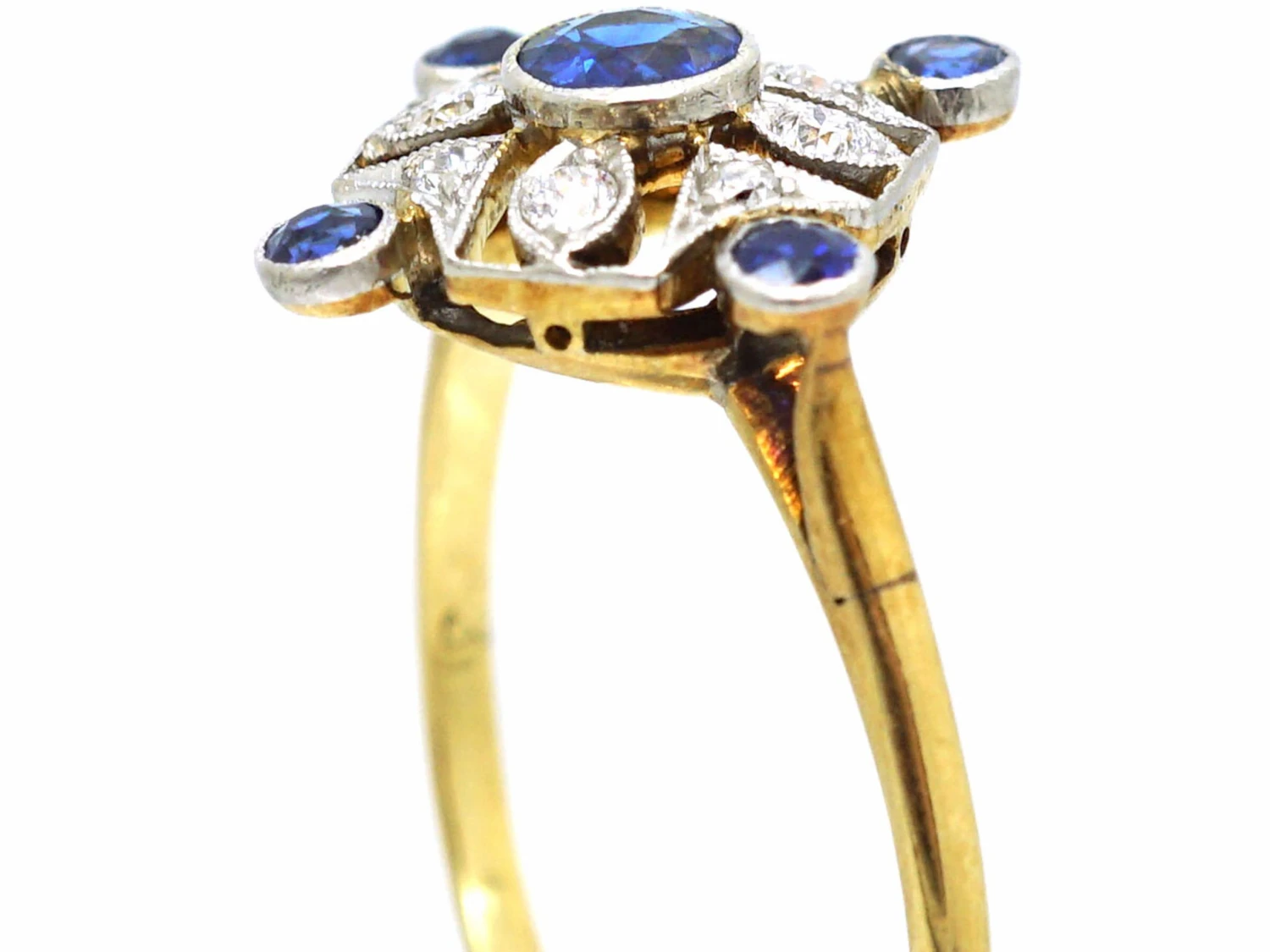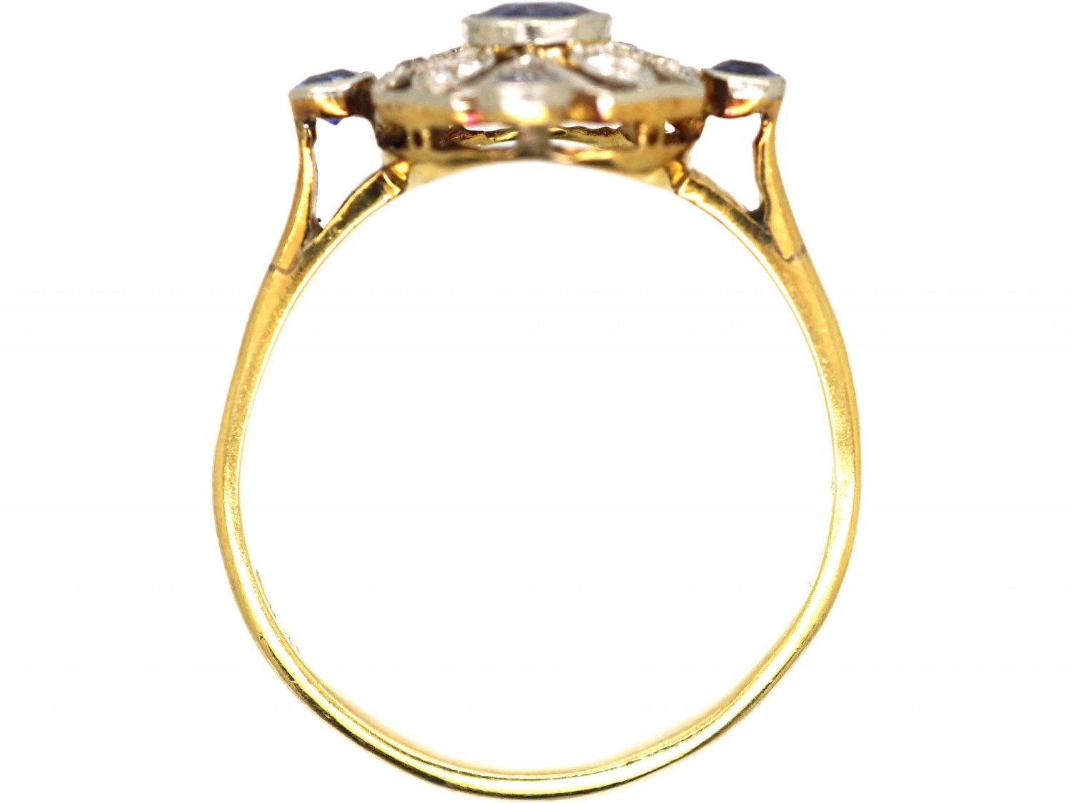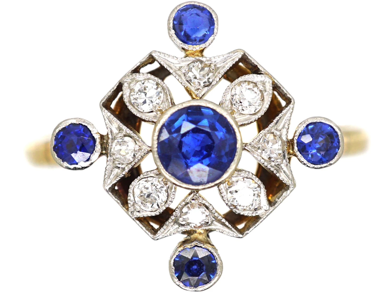 A really pretty 18ct75% pure gold (or 750 parts pure gold and 250 parts other metals) gold ring with a platinumDerives from the Spanish word ‘platina’ meaning ‘little silver’. Acknowledged since the 1900s, platinum’s durability and natural brightness has been and still is today highly treasured A metallic element prized for its rarity, whiteness, high tensile strength and insusceptibility to corrosion, platinum first became widely used in jewellery in the late ninete… top that was made circa 1910-1920. It is an unusual diamondA precious, lustrous gemstone made of highly compressed carbon. Diamonds are one of the hardest materials known to mankind. Colours of diamonds range from colourless, yellow, orange and brown to almost black. Natural coloured (or ‘fancy’) diamonds can be extremely rare. The cut, colour, clarity and carat weight of a diamond are the criteria jewellers use… shaped design. In the centre is a gorgeous mid blue sapphireBlue is the best-known colour for this gemstone but it can be found in all colours of the spectrum. After diamond, sapphire is the hardest gemstone.