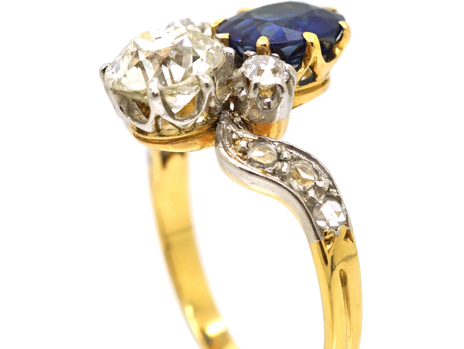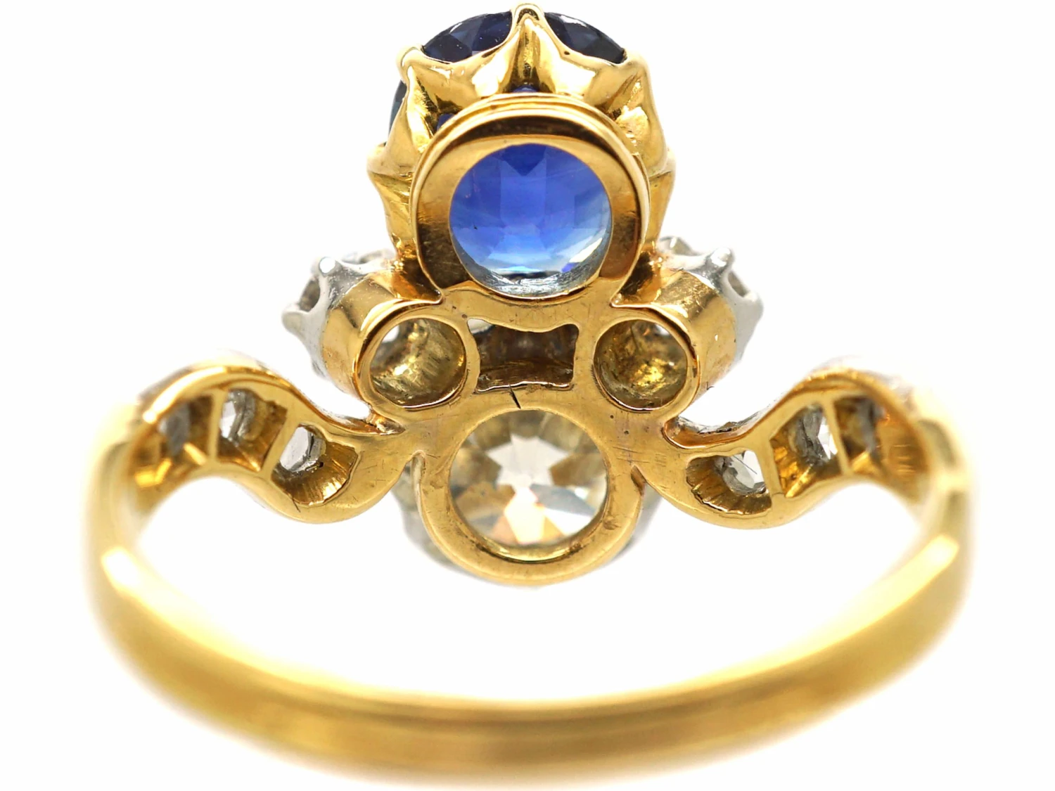This is a gorgeous 18ct75% pure gold (or 750 parts pure gold and 250 parts other metals) gold and platinumDerives from the Spanish word ‘platina’ meaning ‘little silver’. Acknowledged since the 1900s, platinum’s durability and natural brightness has been and still is today highly treasured A metallic element prized for its rarity, whiteness, high tensile strength and insusceptibility to corrosion, platinum first became widely used in jewellery in the late ninete… ring that epitomises the EdwardianJewellery made in the Edwardian era (1901-1914). period. It has been clawA precious metal prong used to hold a gemstone in place. set with a beautiful Royal blue sapphireBlue is the best-known colour for this gemstone but it can be found in all colours of the spectrum. After diamond, sapphire is the hardest gemstone.
