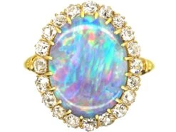 An EdwardianJewellery made in the Edwardian era (1901-1914). 18ct75% pure gold (or 750 parts pure gold and 250 parts other metals) gold ring with a top quality black opalOpals occur in a range of body colours from white, black or grey, bright orangey red and a pale watery colour. The most precious opals show strong colour contrast and generally have a dark body colour with a vivid array of colour play.. It displays a stunning deep blue, red and green play of colour. Black opals were sourced from Lighting Ridge in New South Wales, Australia. They are the most valuable of all the opals. Around the opal are small very bright diamonds. This ring is a top example of a beautiful black opal clusterA group of small diamonds or colourful gemstones grouped together to form a cluster, mimicking the look of a larger gem. Often this group can surround a larger center stone. ring. It is finely made and looks really fantastic when worn.