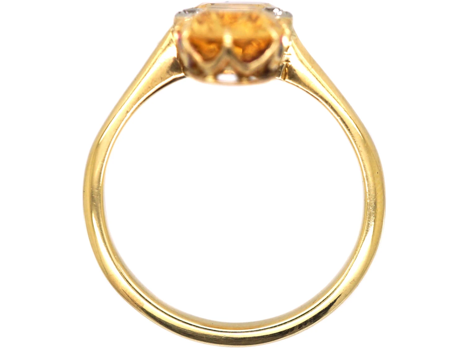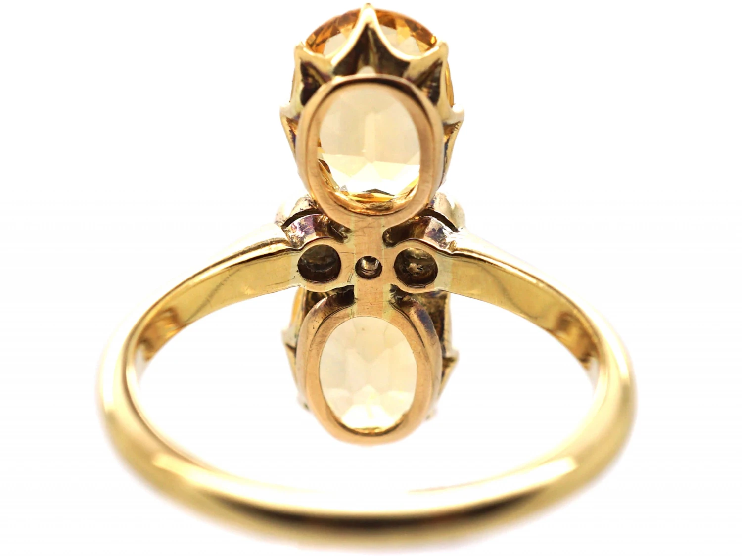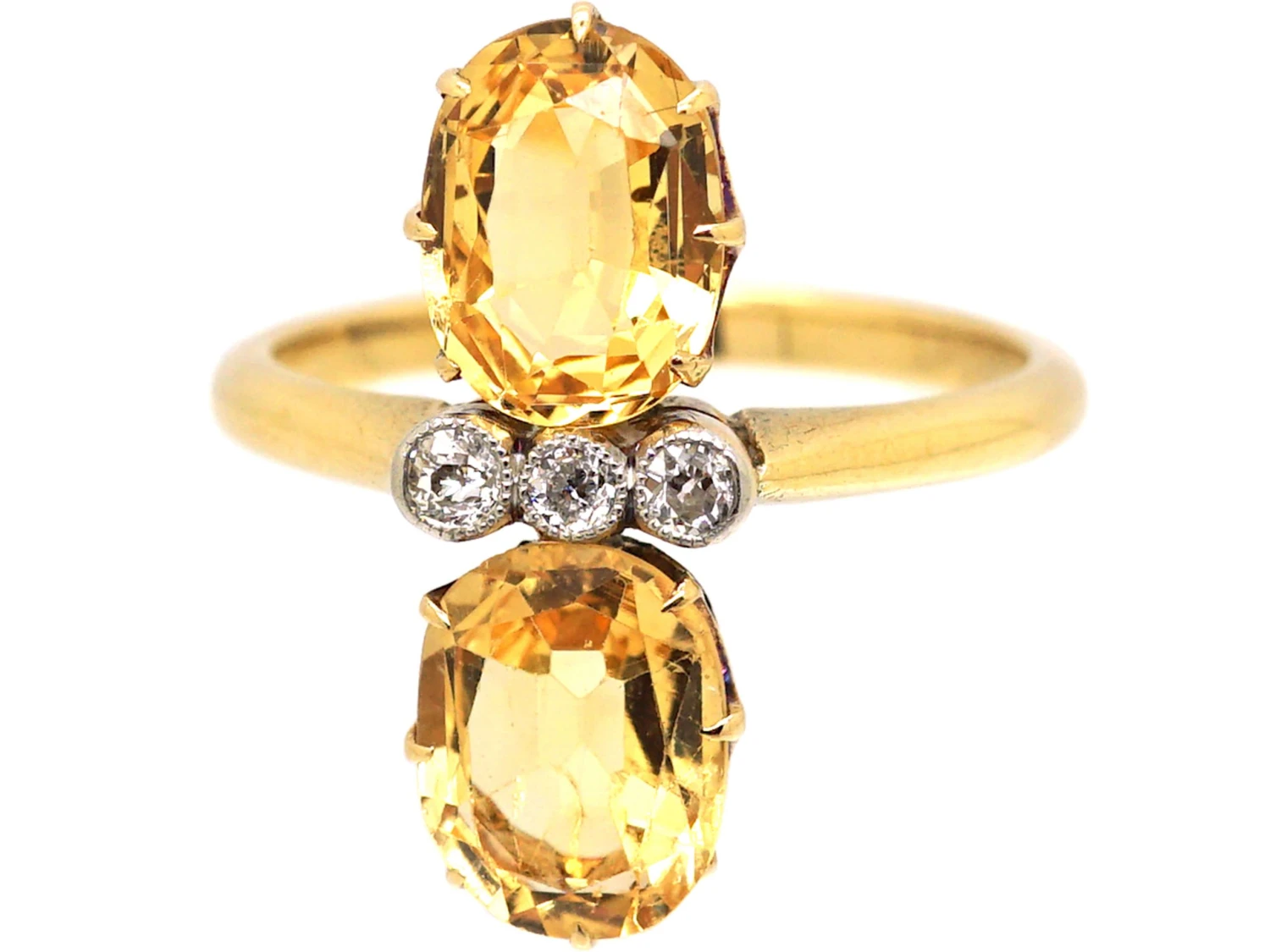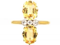 An unusual 18ct gold ring that was made circa 1910-1920. It has been claw set with two well matched oval cut topaz with three small diamonds within millgrained platinum settings in between. Topaz is a very sought after and rare stone. It is quite different to a citrine. The name imperial topaz is said to have originated in 19th century Russia, where the Ural Mountain mines were an important source of topaz reportedly reserved for the royal family. The warm orange of the stone goes beautifully with the colour of the gold.