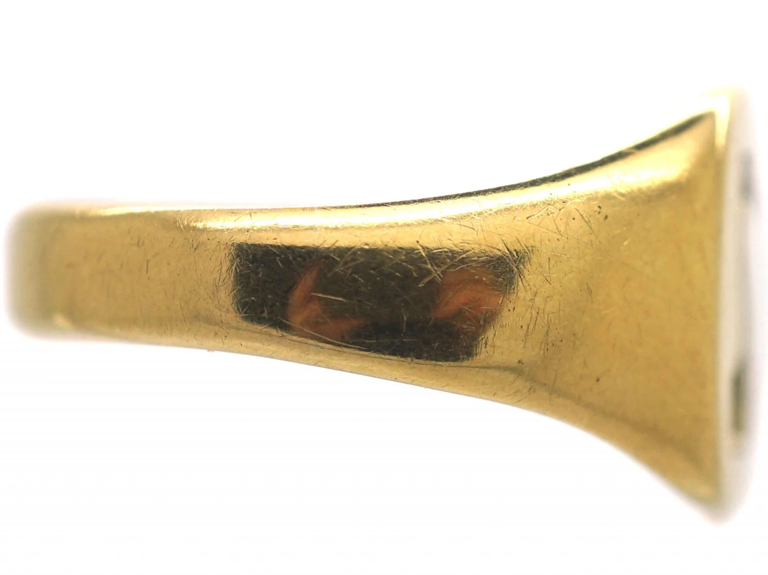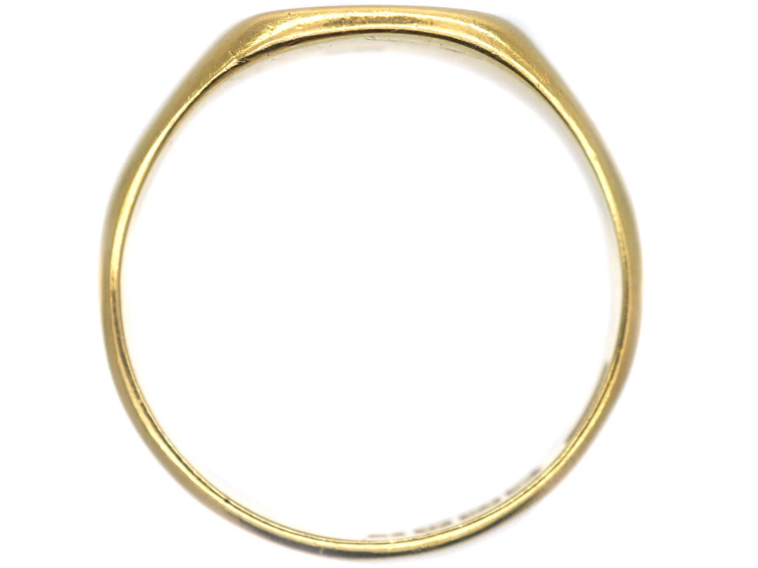 This 18ct75% pure gold (or 750 parts pure gold and 250 parts other metals) gold signet ringA ring with a central plaque on which one’s initials, a seal, or a crest is engraved. was made in Birmingham at the end of the second World War in 1918. It has been engraved with a heraldic crest of a pelican and a crown. The crown is an emblem of Victory, Sovereignty and Empire. The pelican is a symbol of Piety, Self sacrifice and Virtue. A lovely ring to wear