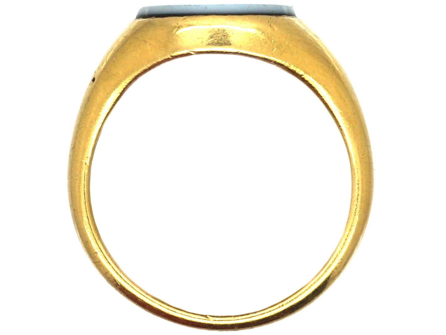 A lovely 18ct75% pure gold (or 750 parts pure gold and 250 parts other metals) gold signet ringA ring with a central plaque on which one’s initials, a seal, or a crest is engraved. that was assayed When the property or concentration of a precious metal is measured. in London in 1918 at the close of World War 1. It has been set with a banded onyxOnyx is an opaque black variety of polycrystalline chalcedony quartz. with a carved intaglioAn engraved stone, the opposite of a cameo, with a recessed design cut below the surface of the stone. Intaglio designs are common for signet rings and fob seals. of a Duke’s head with a coronet. The humble strawberry leaves were always used on coronets in England. They served to remind sovereigns, Dukes and Earls that though elevated to so high a station in society they must never forget that they are just humble men. Engraved inside the shankThe circle of metal that attaches to the decorative part of a ring and encircles the finger. is T to M 4th Oct 1918.