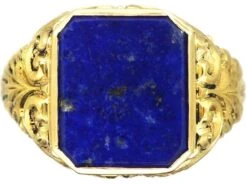 An impressive 18ct75% pure gold (or 750 parts pure gold and 250 parts other metals) gold ring that was made circa 1910-1920. It has been set with a rectangular plaque of lapis lazuliAn historically popular deep blue opaque gemstone. Lapis Lazuli is chiefly composed of the mineral Lazurite and is often flecked with gold Pyrite, giving each stone a unique mysticism. with canted corners. The shouldersThe point on a ring where the central section meets the shank or band, often carved, decorated or inlaid with small diamond accent stones. are a riot of leaves and scrolls that continue around the sides. The shankThe circle of metal that attaches to the decorative part of a ring and encircles the finger. is a reeded design. It has been beautifully finished with a frosted coat on the gold. It is hard to say exactly where it was made. It could possibly be of German or Dutch origin