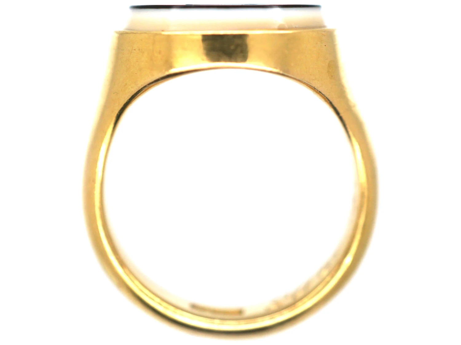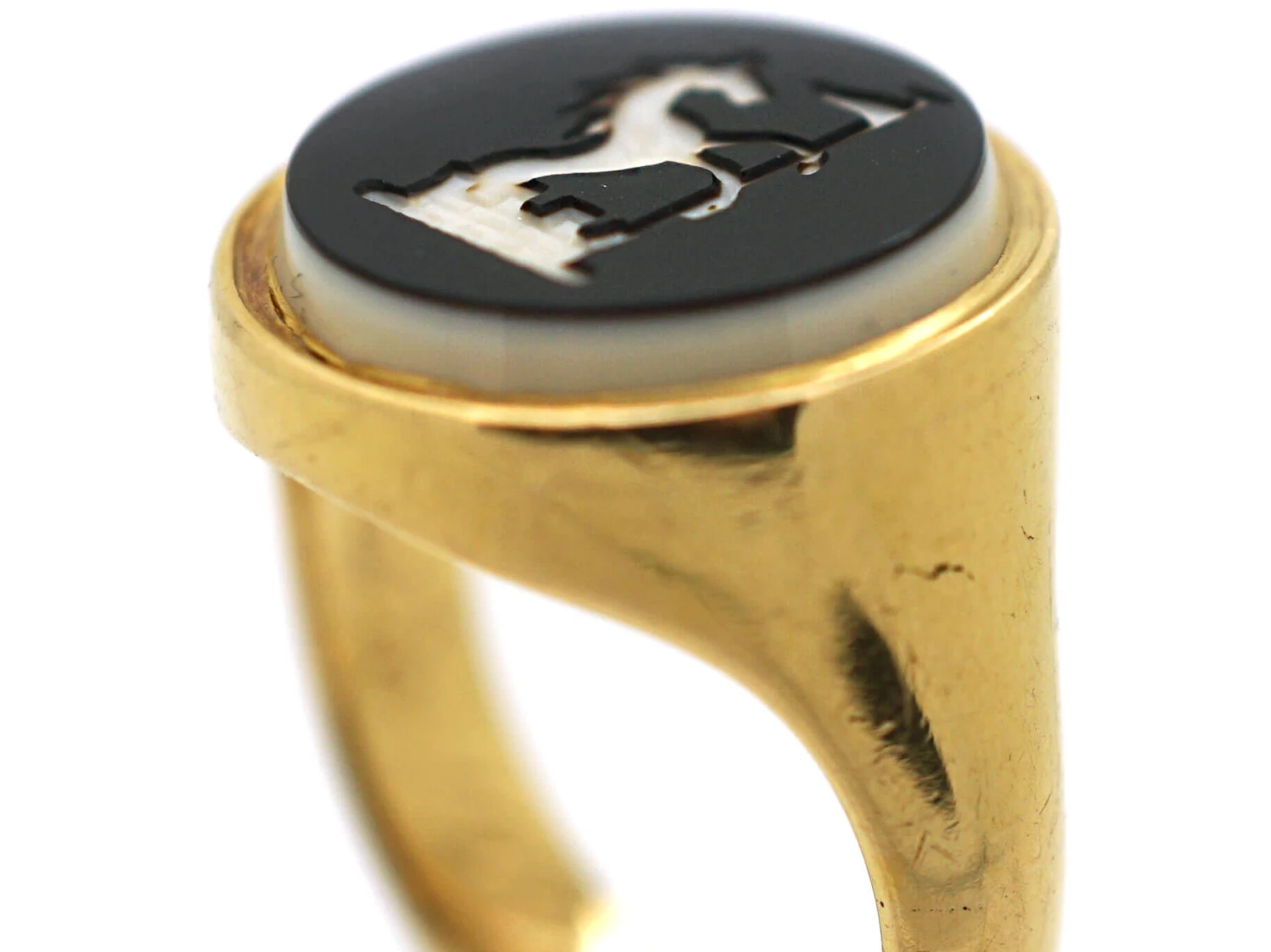 A rare and wonderful 18ct75% pure gold (or 750 parts pure gold and 250 parts other metals) gold ring that was made around 1908. The top is a banded sardonyx that has been cut with a detailed intaglioAn engraved stone, the opposite of a cameo, with a recessed design cut below the surface of the stone. Intaglio designs are common for signet rings and fob seals. of a rearing horse holding a pennant above a castellated crown. The shankThe circle of metal that attaches to the decorative part of a ring and encircles the finger. has been modelled to compliment the stone. It is a smart and very unusual signet ringA ring with a central plaque on which one’s initials, a seal, or a crest is engraved..
