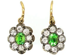 A beautiful pair of cluster earrings that were made circa 1900-1910. They have been set with green garnets within a circle of well matched bright white old mine cut diamonds. Green garnets or Demantoid garnets as they are known, are wonderful stones and are a lovely apple green colour. Although garnets have been known since ancient times, the demantoid variety was not discovered until 1868 in Russia’s western central Ural Mountains. Miners were immediately stunned by the highly refractive nature of the gem material. They began comparing it to diamond and referred to it as “demantoid”, from the French “demant” meaning diamond. The reason is obvious, with its high brilliance and dispersion. These bright apple green stones are comparatively rare and very expensive, so we always try to source original pieces from the Edwardian period as with these lovely cluster earrings.