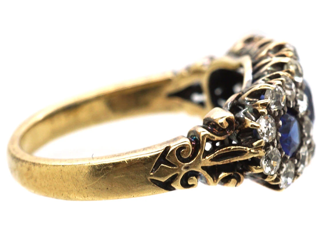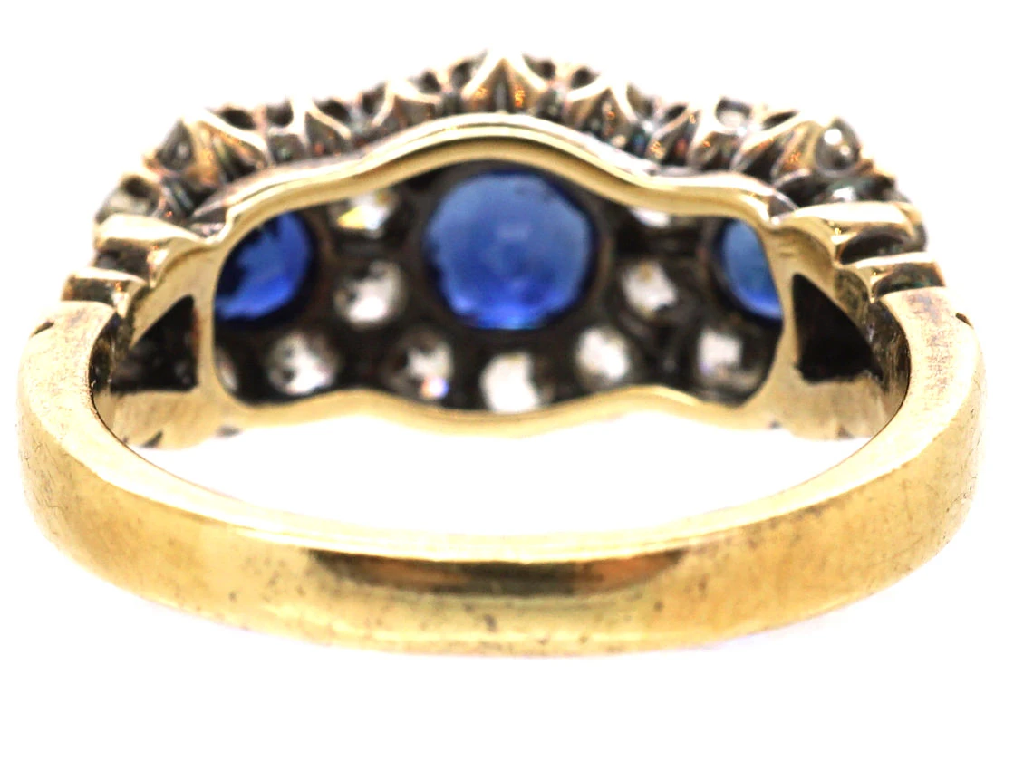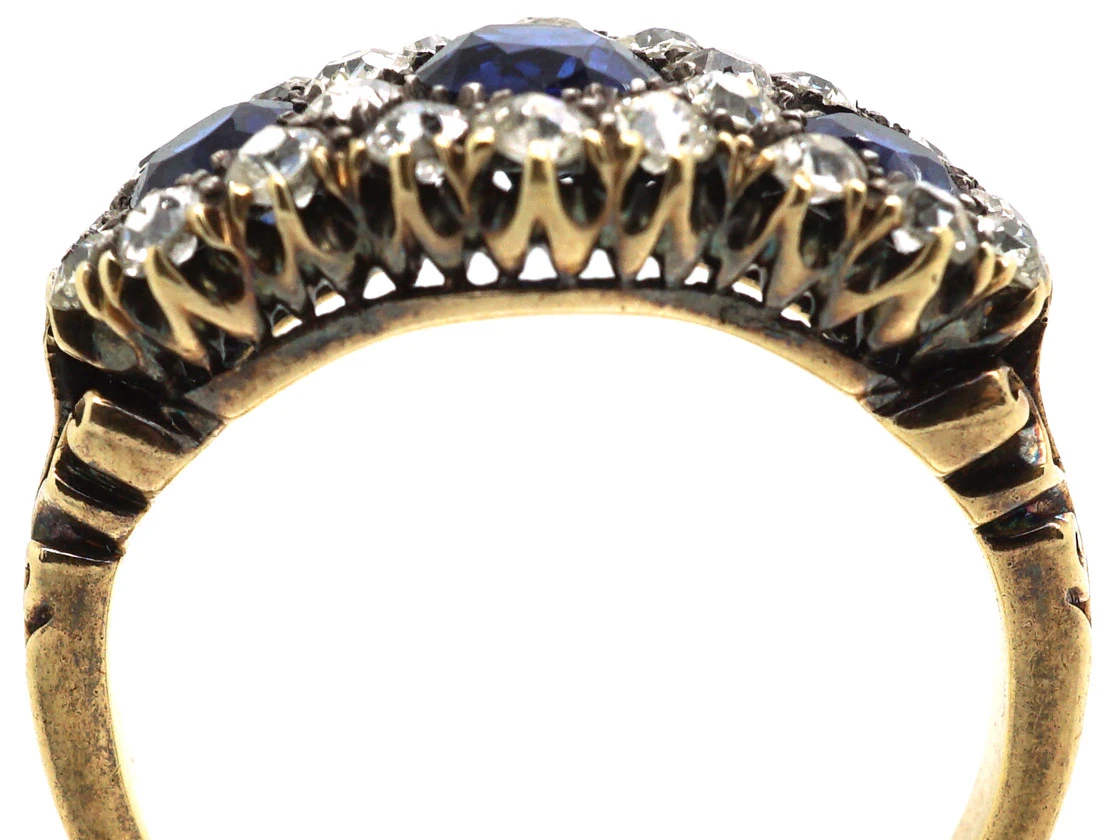 This is a beautiful ring and in great condition. It was made circa 1890-1900 and has been set with three well matched naturalA natural stone is called such because it has not been subjected to any treatments. mid blue colour sapphires. They are surrounded by well matched and white old mine cutAn 18th, 19th and early 20th century diamond shape, typically cushion or asymmetrical, marked by a small table, a high crown and a large culet. Culets are the small flat facets at the bottom of a stone which appear to the untrained eye as a hole in the middle of the stone. Before the advent of modern machinery which allows for the precise faceting we see tod… diamonds in a triple clusterA group of small diamonds or colourful gemstones grouped together to form a cluster, mimicking the look of a larger gem. Often this group can surround a larger center stone. design. It curves around the finger and sits quite low. It would make an amazing engagement ring.