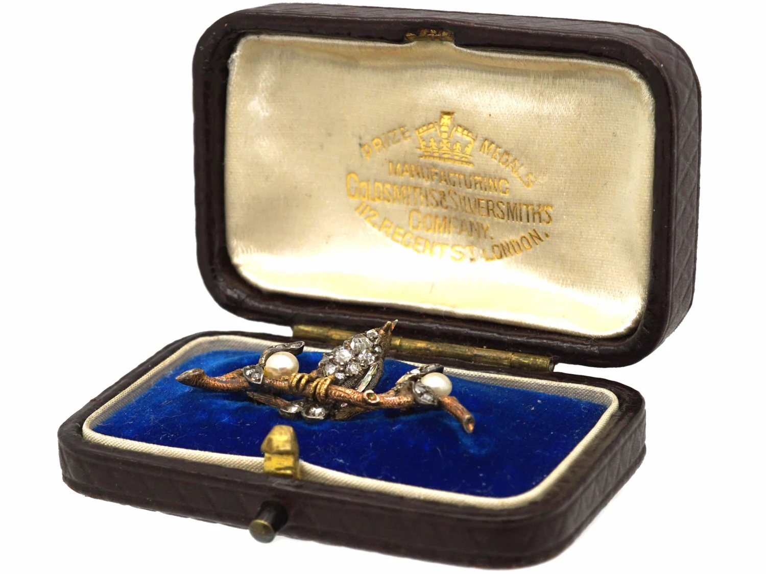 . Historically, mistletoe represents romance, fertility, and vitality so this novelty brooch may have originally been given to a lady by an admirer. It comes in the original case and was retailed by the Goldsmiths and Silversmiths Company who had been awarded the Royal Warrant and were based in 112 Regent Street.London.