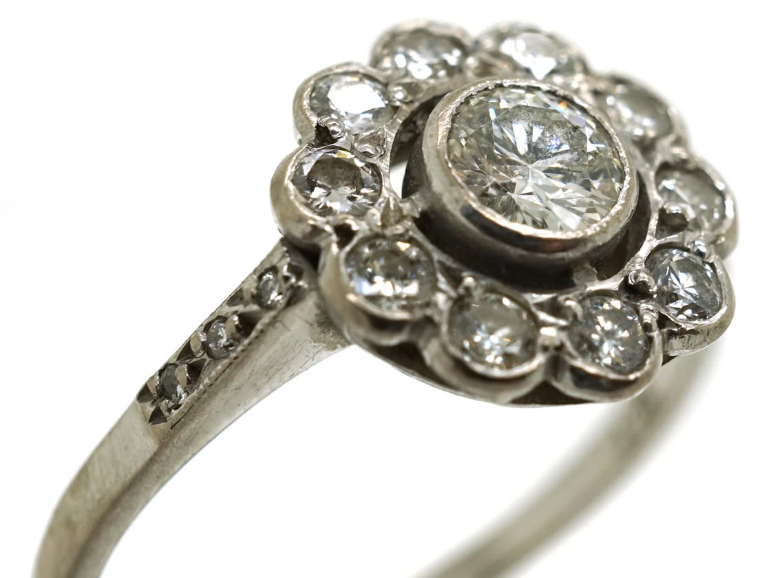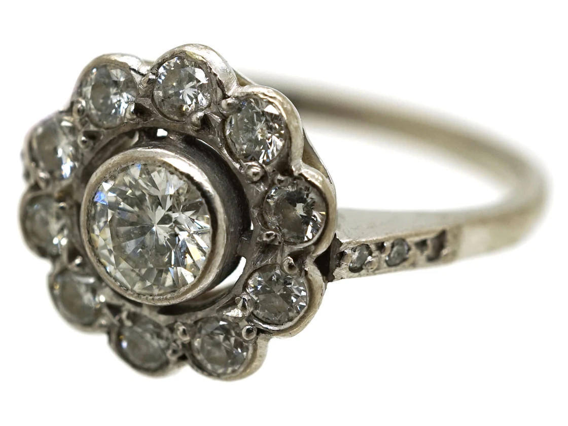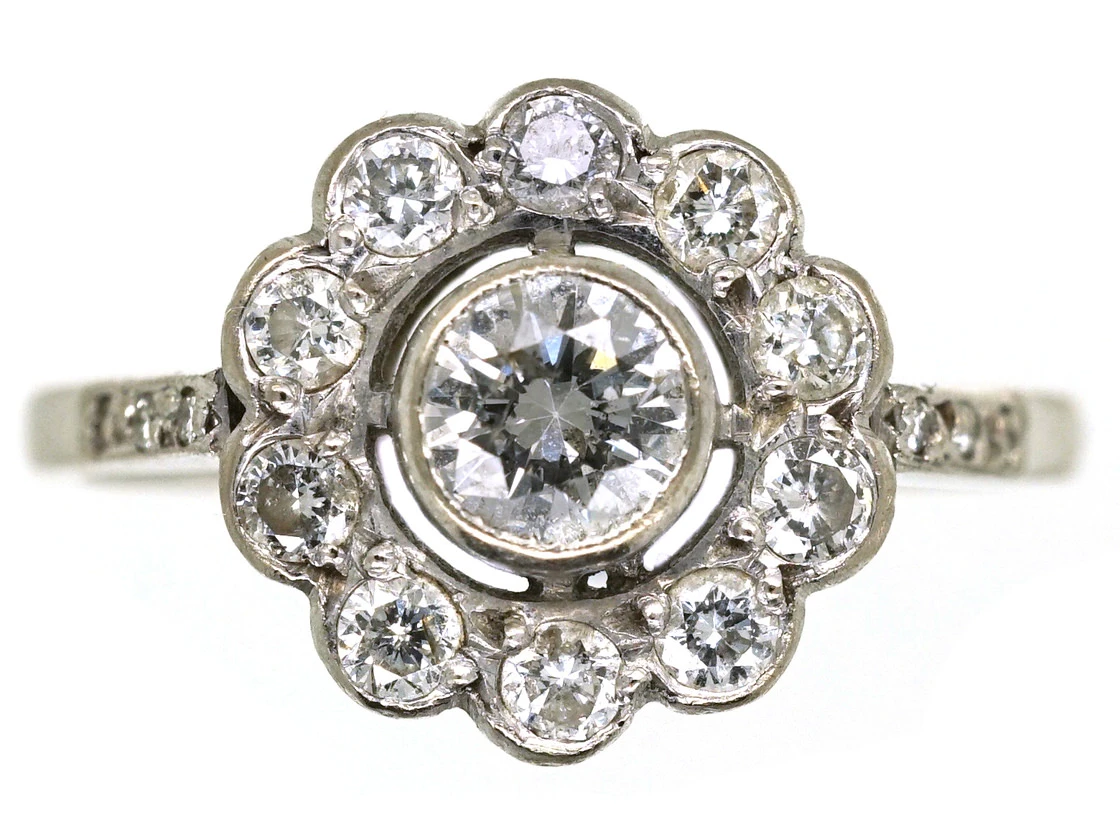 A very pretty diamondA precious, lustrous gemstone made of highly compressed carbon. Diamonds are one of the hardest materials known to mankind. Colours of diamonds range from colourless, yellow, orange and brown to almost black. Natural coloured (or ‘fancy’) diamonds can be extremely rare. The cut, colour, clarity and carat weight of a diamond are the criteria jewellers use… clusterA group of small diamonds or colourful gemstones grouped together to form a cluster, mimicking the look of a larger gem. Often this group can surround a larger center stone. ring. It is 18ct75% pure gold (or 750 parts pure gold and 250 parts other metals) white goldWhite gold is an alloy of gold and at least one other white metal – most often nickel or palladium (both of which act as a bleaching agent to reduce the natural yellow colour of the gold). with a diamond set daisy cluster design with diamond set shouldersThe point on a ring where the central section meets the shank or band, often carved, decorated or inlaid with small diamond accent stones.. The centre stone is slightly raised which gives the ring a good profile, although it still sits low on the finger. It would make a lovely engagement ring.