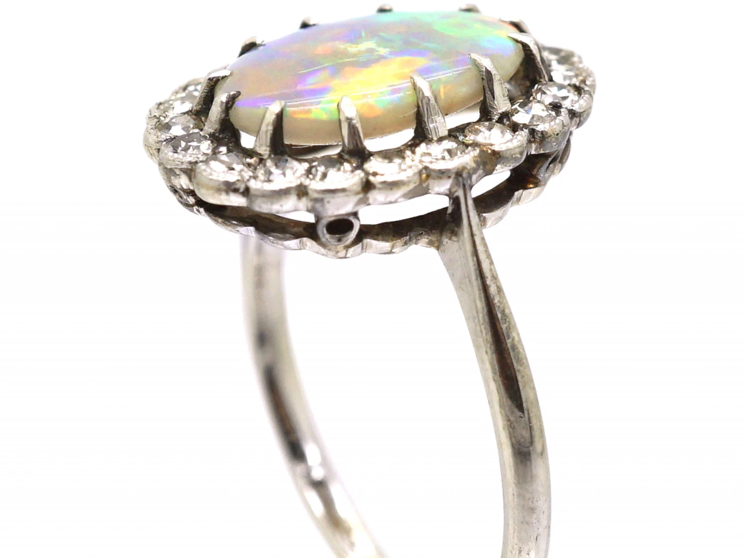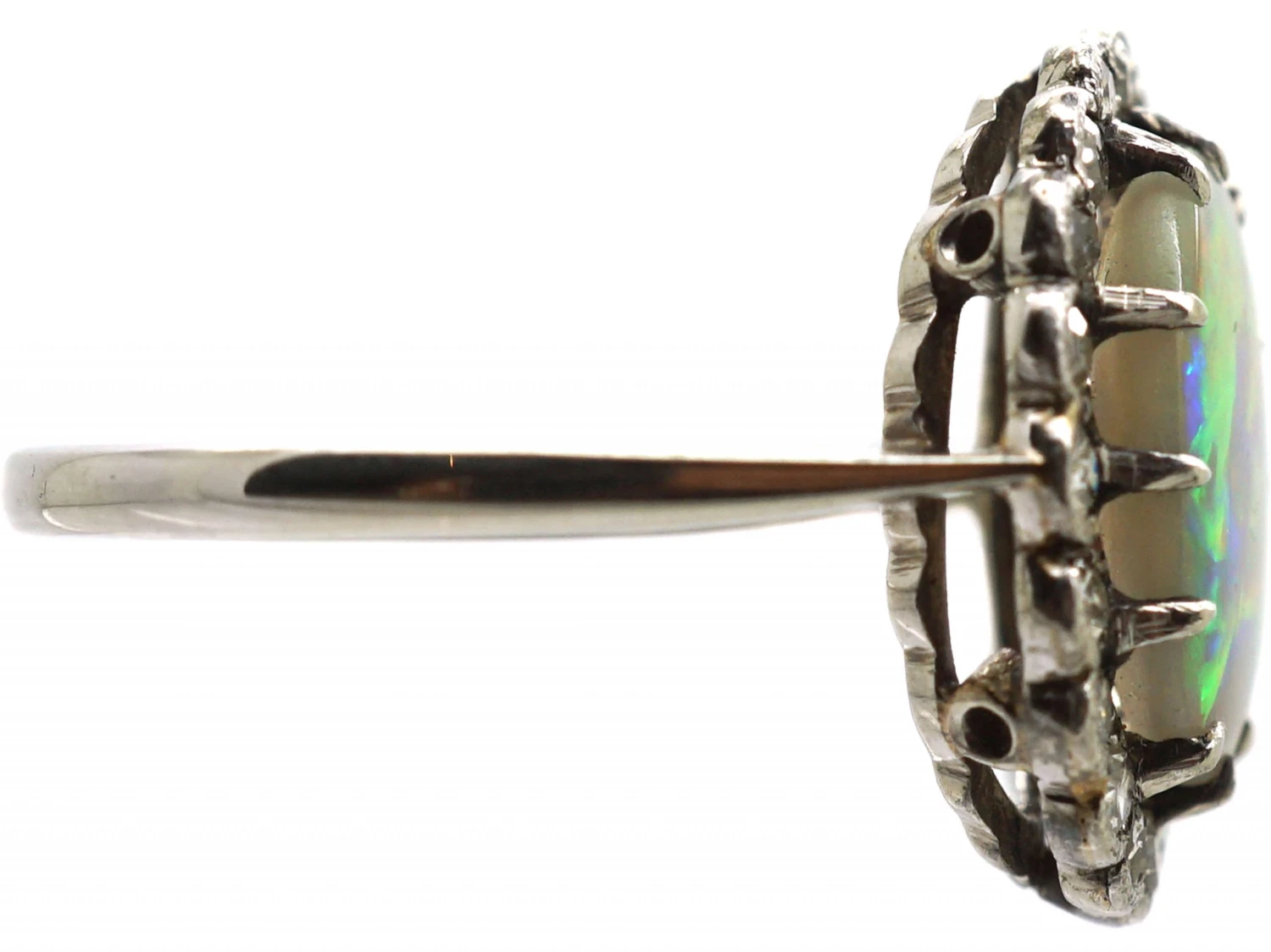 A beautiful 18ct white gold ring with a platinum top that was made circa 1910-1920.. It has been claw set with a black opal that displays a myriad of flashing colours, red, blue and green. Unlike ordinary opals, black opals have carbon and iron oxide trace elements present, which cause the unusual darkness of the stone. They are rare and stunning stones and the black opal in this ring is a particularly good example. Around the opal on a slightly lower level are small well matched diamonds within millgrain settings.