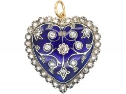 An unusual 18ct75% pure gold (or 750 parts pure gold and 250 parts other metals) white goldWhite gold is an alloy of gold and at least one other white metal – most often nickel or palladium (both of which act as a bleaching agent to reduce the natural yellow colour of the gold). heart shaped pendant that was made circa 1900-1910. It is such a pretty design with stylised plant forms set with old mine cutAn 18th, 19th and early 20th century diamond shape, typically cushion or asymmetrical, marked by a small table, a high crown and a large culet. Culets are the small flat facets at the bottom of a stone which appear to the untrained eye as a hole in the middle of the stone. Before the advent of modern machinery which allows for the precise faceting we see tod… diamonds and rose diamonds over a royal blue enamelA pigmented glass-like material used in powdered form and fused onto the metal surface of a piece of jewellery. ground. Around the edge are rose diamonds. On the reverse is a heart shaped glazed compartment for a photograph. The EdwardianJewellery made in the Edwardian era (1901-1914). period was such a pretty and decorative period and this heart is no exception