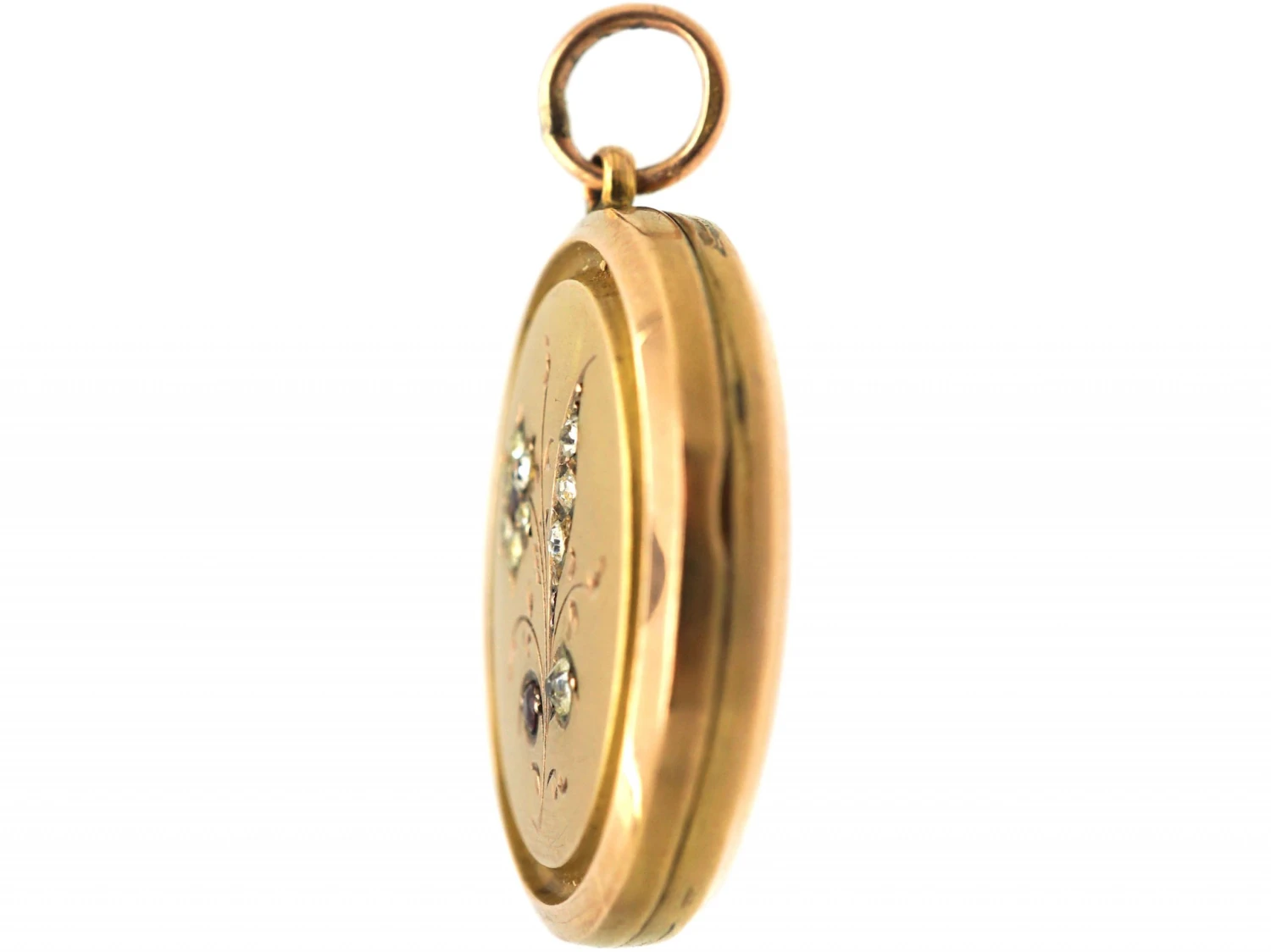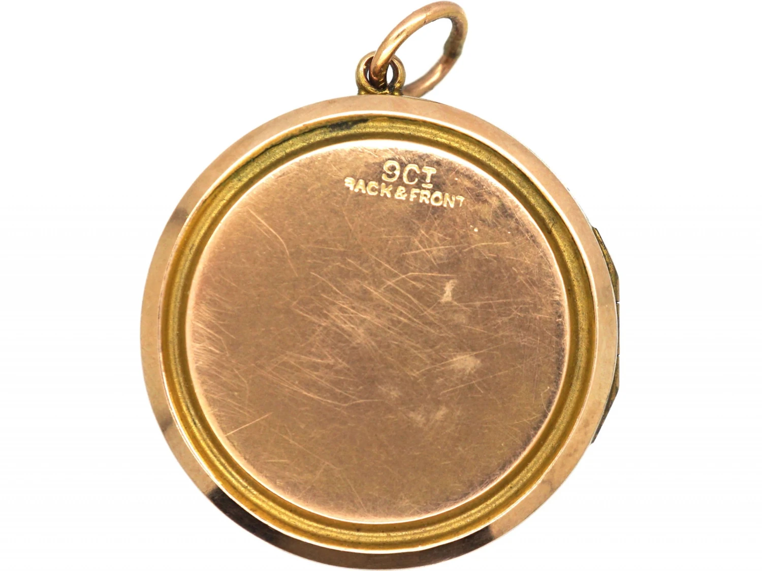 Timeless and so pretty this round locket looks lovely when worn on a medium length chain. It was made circa 1910 and has a flower motif on the front set with red and white pasteGlass made to resemble gem materials, which may be moulded, faceted, carved, etc. . Inside are two compartments for photographs. It is 9ct37.5% pure gold (or 375 parts pure gold and 625 parts other metals) back and front which means that both sides are gold but the hinges and sides are base metal.
