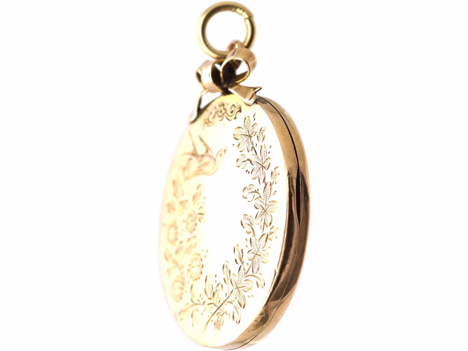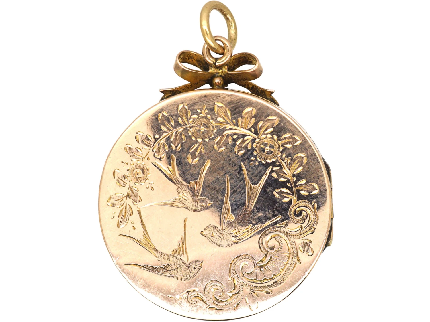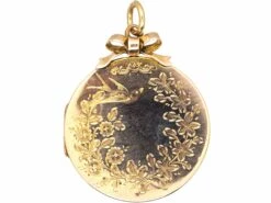 A round locket that was made circa 1900-1910. It is 9ct37.5% pure gold (or 375 parts pure gold and 625 parts other metals) back and front. The term â9ct Back & Frontâ means the front and back are 9ct gold and the inner frames and hinges are metal. It is a lovely design and has been engraved on both sides with swallows and branches of roses. The swallow was considered daring, risk-seeking, and a symbol of change for good in the future. It also meant âEverlasting loveâ and âloyaltyâ as swallows mate for life. The rose branches emphasise love. It opens to reveal two compartments for photographs.