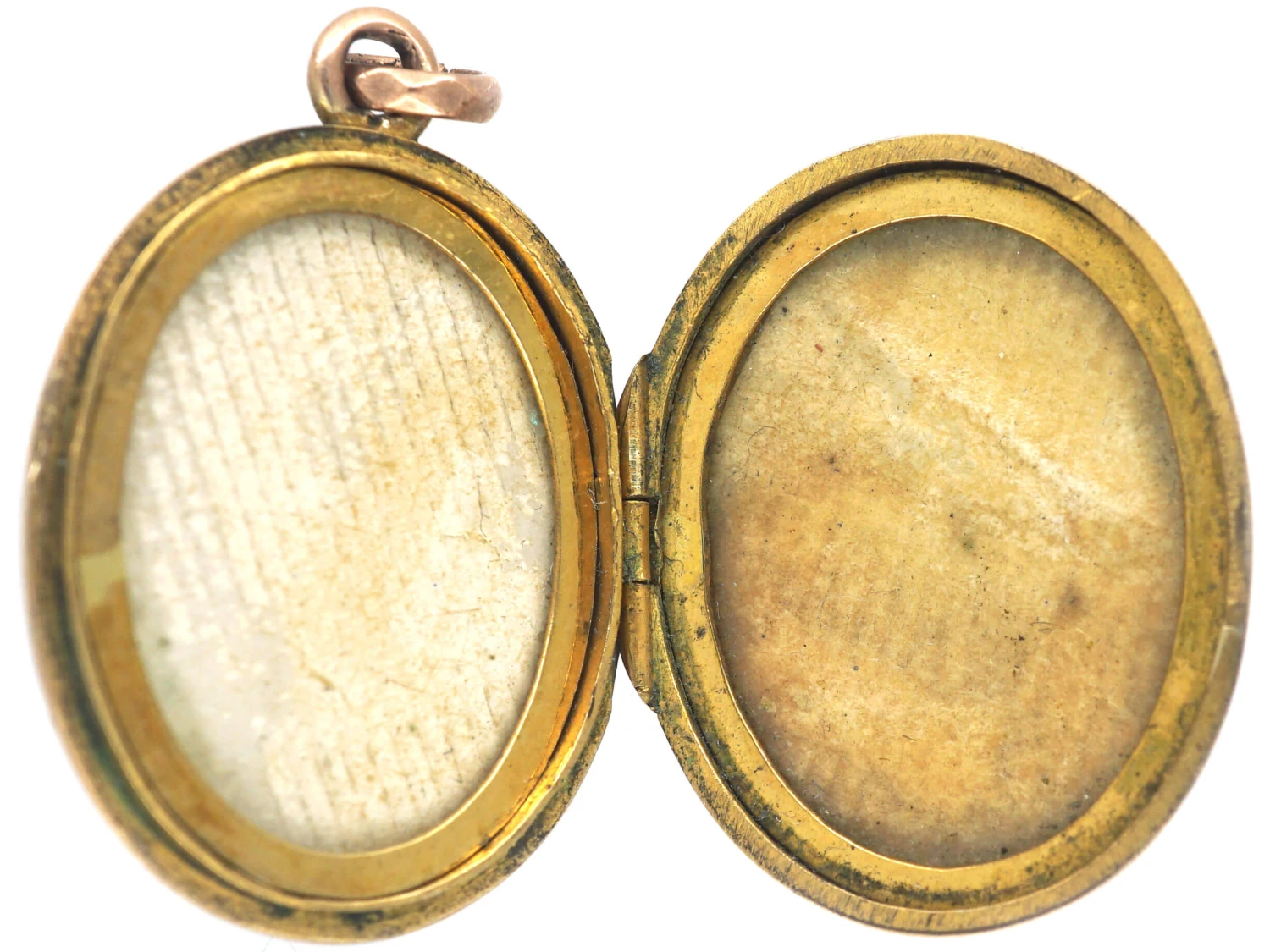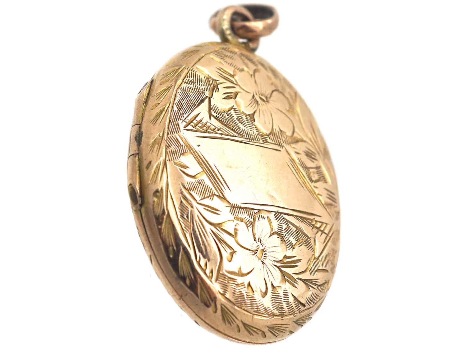 A pretty oval locket that has been engraved on both sides with leaves and flowers. There is a plain area so that you can engrave initials if wanted. Inside are two compartments for photos so it would be an ideal gift.