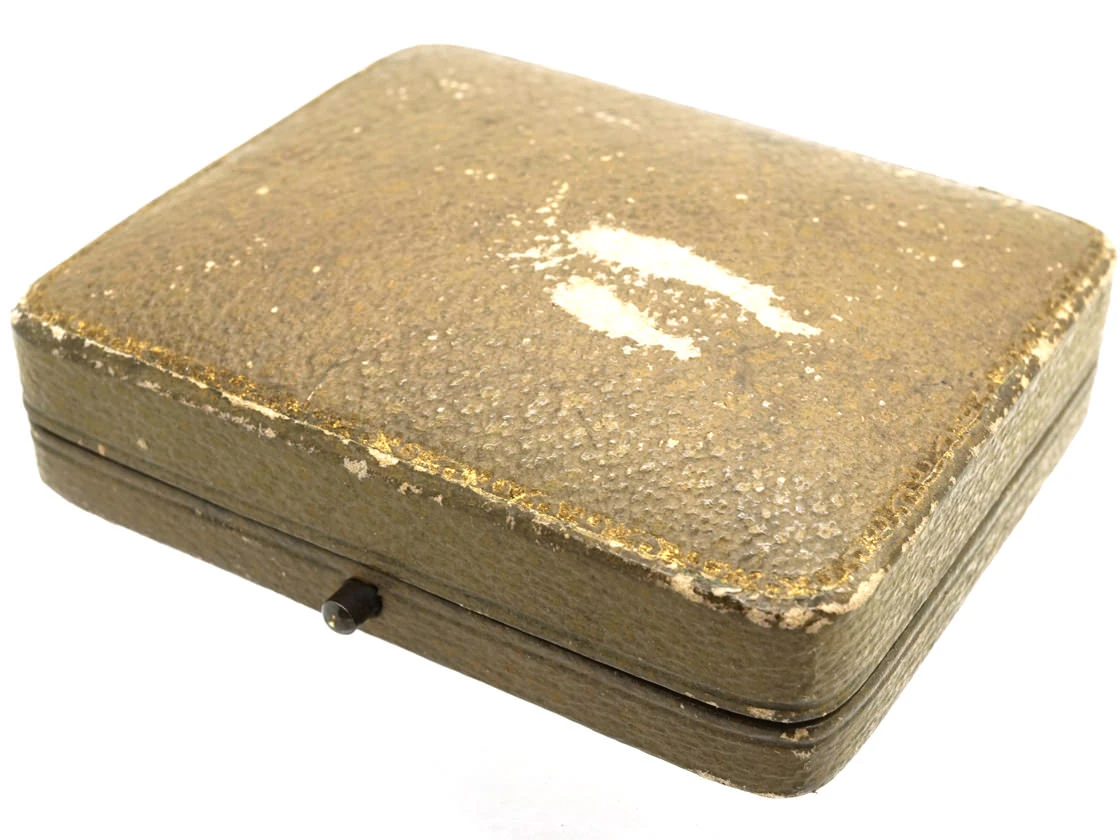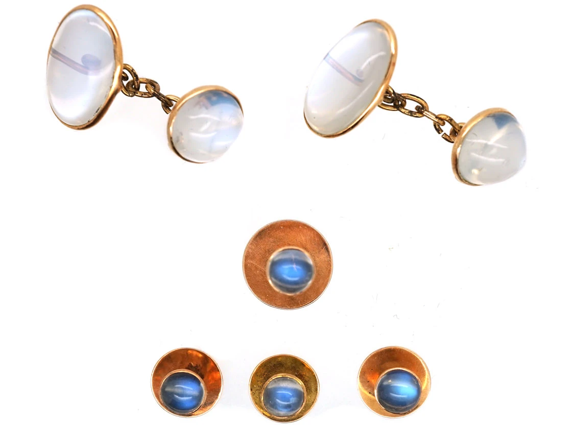 A smart cased set of 9ct37.5% pure gold (or 375 parts pure gold and 625 parts other metals) gold and moonstoneMoonstone, the alluring pale gemstone, is known for its attractive pearly sheen and is so named for its resemblance to the moon. cufflinks, values and studs. It is interesting to note that the silk inside the box reads “D.F de Silva & Co Colombo CeylonSri Lankan (Ceylon was the country’s former name until 1972). Under the most distinguished patronage of the Duke & Duchess of Connaught”. So they were retailed in Ceylon, where these moonstones were sourced, by a reputable jewellers. You cannot find such blue, white moonstones nowadays as the modern ones are quite opaque.