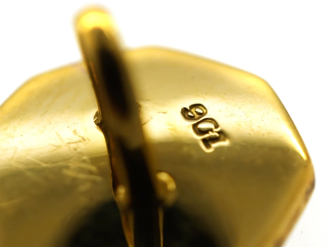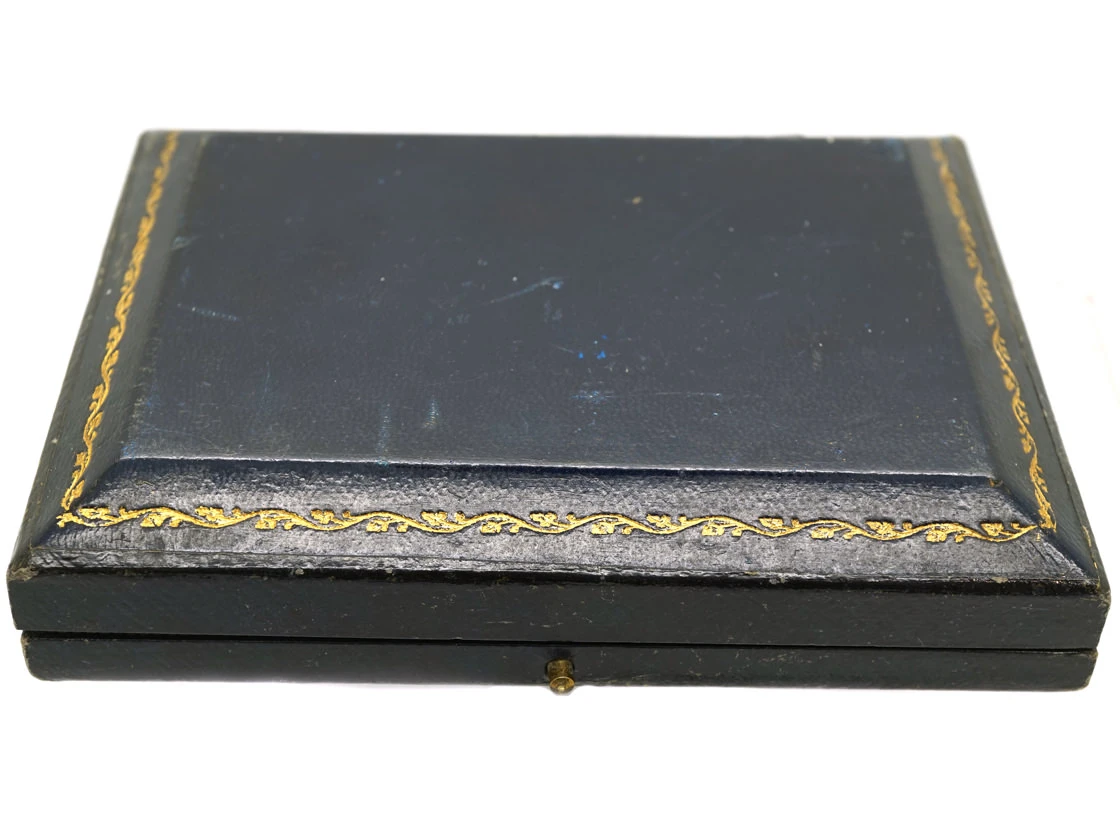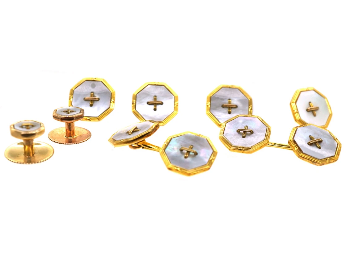 A beautifully presented set of cufflinks, values and studs. The case is tooled leather over a wood base, and was retailed by Mappin and Webb, who had a Royal appointment status. The cufflinks, values and studs all have a typically decorative 9ct37.5% pure gold (or 375 parts pure gold and 625 parts other metals) gold edge with criss cross design, and criss cross knots in the centre to imitate values. The base is mother of pearlThe iridescent inner layer of certain molluscs such as oysters or abalones which is used as a decorative inlay. which adds a good contrast to the gold. This set is in excellent condition and would be an ideal gift.