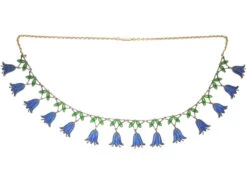necklace that was made circa 1900-1910. It is composed of fourteen hair bells that have been enamelled in the Plique a Jour technique. Plique-à-jourA French term that translates (as nearly as can be determined) to “letting in the daylight” and defines a type of transparent enamel that has no backing. Similar to a stained glass window, the design has a metal outline filled with various coloured transparent, glass-like enamels.