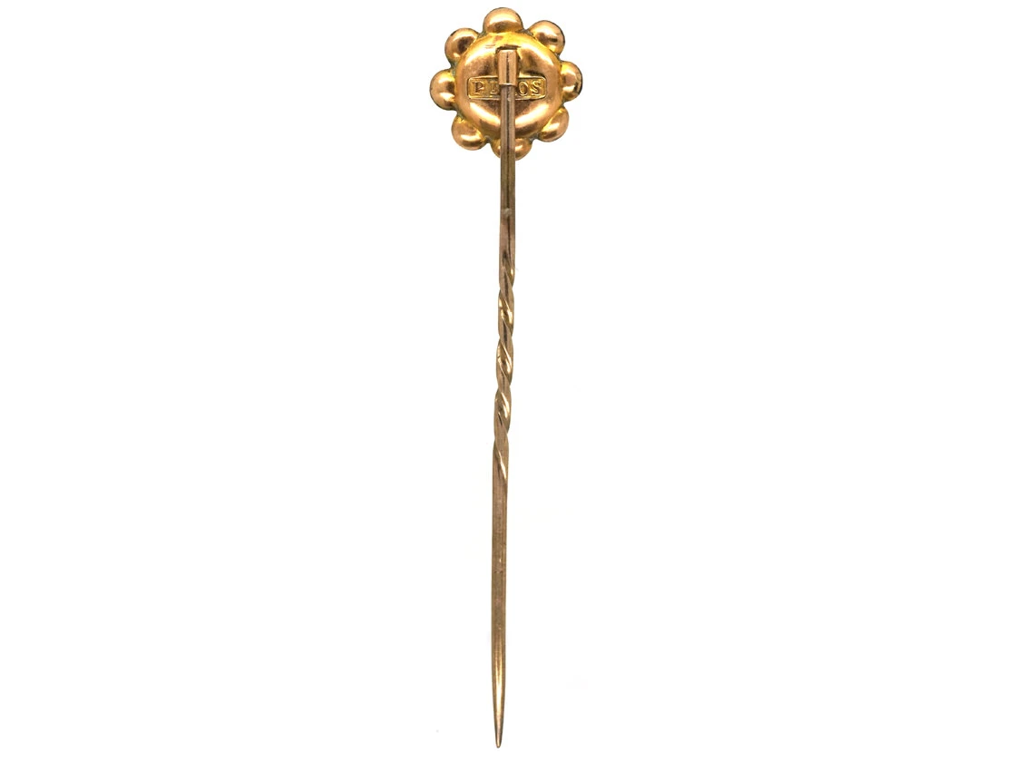 A pretty 9ct37.5% pure gold (or 375 parts pure gold and 625 parts other metals) gold tie pin that was made circa 1900-1910. It is a flower design and set with an almandineA variety of red garnet that is transparent and commonly deep crimson with tinges of purple. Its colour can resemble that of ruby. It is cut in several forms; when cut en cabochon (usually as hollow cabochon to lighten the colour), it is called carbuncle. garnetDescribes a group of several closely related minerals. Garnets come in a variety of colours, however the most common colour is dark red. In descriptions, ‘garnet’ tends to refer to dark red stones unless otherwise specified.. All our tie pins come with a stopper at the end of the pin.