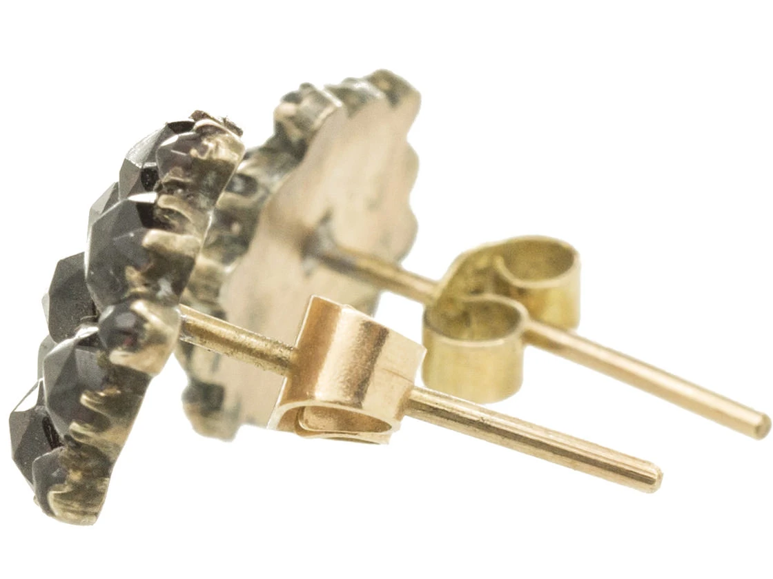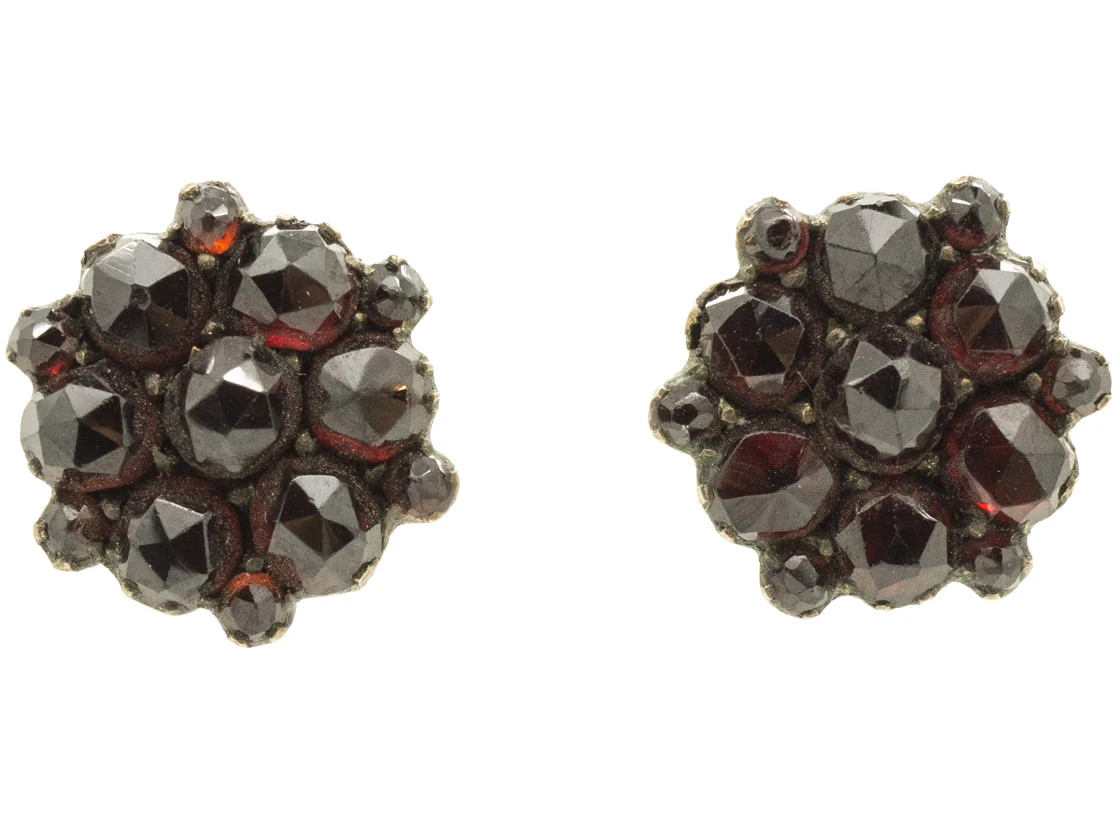 A pretty pair of Bohemian garnetDescribes a group of several closely related minerals. Garnets come in a variety of colours, however the most common colour is dark red. In descriptions, ‘garnet’ tends to refer to dark red stones unless otherwise specified. clusterA group of small diamonds or colourful gemstones grouped together to form a cluster, mimicking the look of a larger gem. Often this group can surround a larger center stone. earrings that were made circa 1900-1910. The garnets are rose cutThe ‘rose cut’, defined by its rounded outline and multiple triangular facets, is one of the earliest diamond cuts, with its origins in sixteenth century Europe. A rose cut typically has a flat base and anywhere from six to twenty four facets, the latter known as a full rose cut. so they catch the light when worn.