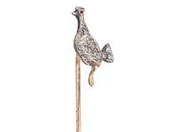 A good gift for the head of the family! This is a well modelled cockerel set with a mixture of old mine cutAn 18th, 19th and early 20th century diamond shape, typically cushion or asymmetrical, marked by a small table, a high crown and a large culet. Culets are the small flat facets at the bottom of a stone which appear to the untrained eye as a hole in the middle of the stone. Before the advent of modern machinery which allows for the precise faceting we see tod… and rose diamonds. He has a little cabochonA polished, not faceted, dome shaped stone – either round or oval with a flat polished base, primarily used as a cut for phenomenal stones such as cat’s eyes and stars.