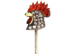 An unusual tie pin of a cockerel that was made circa 1900-1910. In English jewellery the cockerel or rooster was a symbol of courage and fortitude. In the Chinese zodiac, it conveys fortune, fidelity and protection. So this little tie pin is quite special. It was made circa 1900-1910 and is set with rose diamonds and has been enamelled in red on its comb and has a cabochonA polished, not faceted, dome shaped stone – either round or oval with a flat polished base, primarily used as a cut for phenomenal stones such as cat’s eyes and stars.
