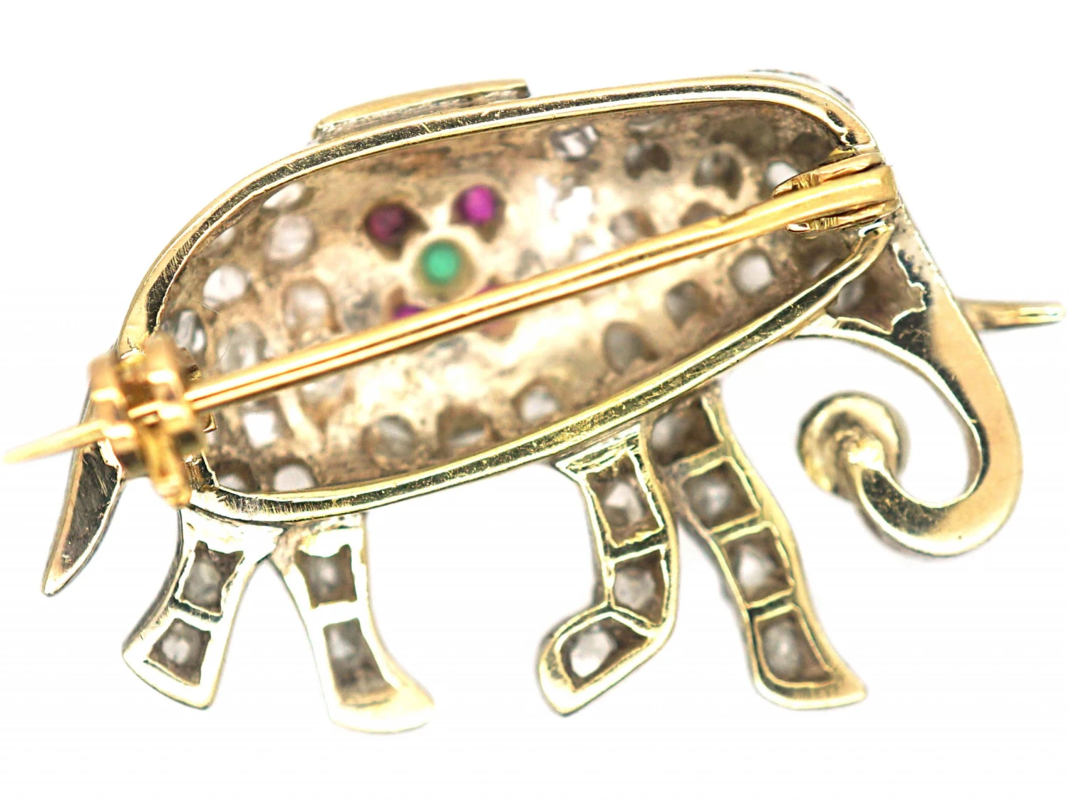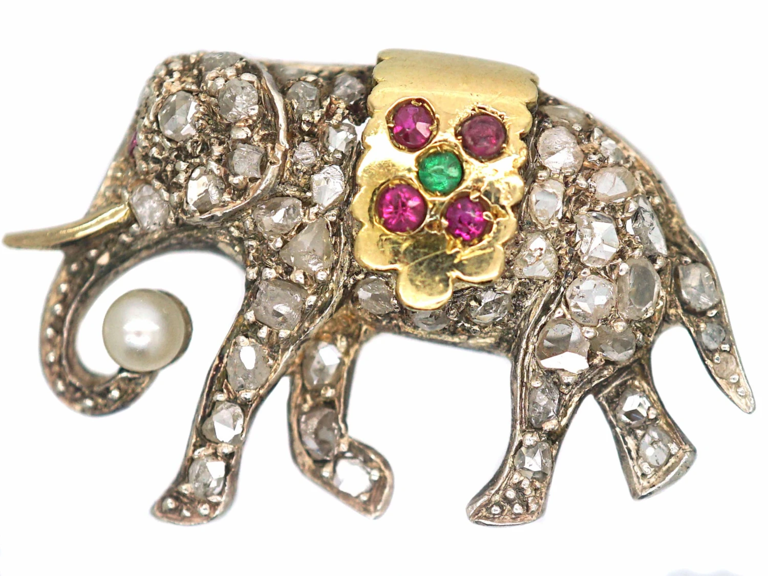 This is a wonderful and beautifully modelled brooch of an elephant plodding along that was made circa 1900-1910. It has been set with rose cutThe ārose cutā, defined by its rounded outline and multiple triangular facets, is one of the earliest diamond cuts, with its origins in sixteenth century Europe. A rose cut typically has a flat base and anywhere from six to twenty four facets, the latter known as a full rose cut. diamonds in silverA metallic element which is malleable and ductile, and white in colour, making it ideal for use in jewellery. It is usually mixed with copper to improve its hardness.