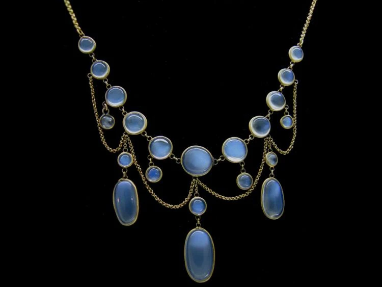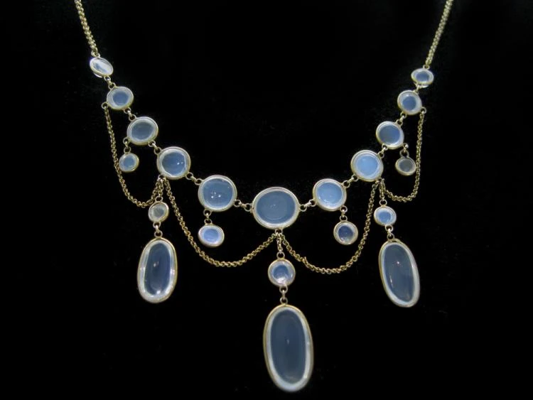 A beautiful EdwardianJewellery made in the Edwardian era (1901-1914). Gold MoonstoneMoonstone, the alluring pale gemstone, is known for its attractive pearly sheen and is so named for its resemblance to the moon. Necklace.