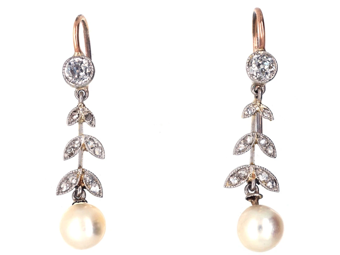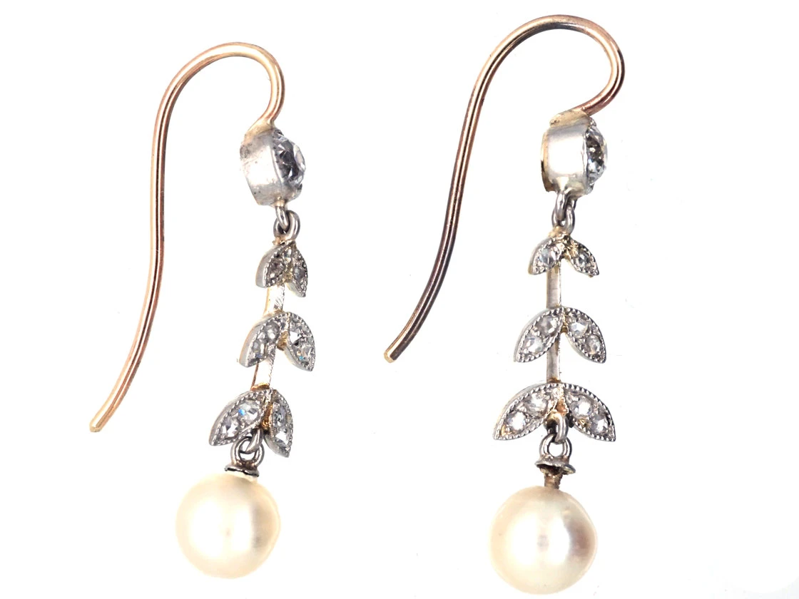 A really pretty and original pair of EdwardianJewellery made in the Edwardian era (1901-1914). drop natural pearlA pearl-bearing mollusc that has not been tampered with by man to produce a cultivated pearl will produce a ‘natural pearl’. and diamondA precious, lustrous gemstone made of highly compressed carbon. Diamonds are one of the hardest materials known to mankind. Colours of diamonds range from colourless, yellow, orange and brown to almost black. Natural coloured (or βfancyβ) diamonds can be extremely rare. The cut, colour, clarity and carat weight of a diamond are the criteria jewellers use… earrings. The front is platinumDerives from the Spanish word ‘platina’ meaning ‘little silver’. Acknowledged since the 1900s, platinum’s durability and natural brightness has been and still is today highly treasured A metallic element prized for its rarity, whiteness, high tensile strength and insusceptibility to corrosion, platinum first became widely used in jewellery in the late ninete… and the back 15ct62.5% pure gold (or 625 parts pure gold and 375 parts other metals). Popular during the Victorian, Edwardian and Art Deco eras but was discontinued in the mid-1930s. gold. They have a 15 pointA unit of weight for a diamond, being one-hundredth of a metric carat. It is used for weights that are decimal fractions of a carat, and all figures after the second decimal point are, in the diamond and jewellery trade, generally discarded. diamond at the top then three leaves set with small rose diamonds, terminating with a naturalA natural stone is called such because it has not been subjected to any treatments.Β pearlNatural pearls are an organic gem formed inside live mollusc shells and come in all shapes and sizes. They are formed as the result of a natural irritant within the mollusc’s mantle and as a defence, layers of iridescent nacre form over the top of it, creating a pearl.Β . They would look lovely as part of a bridal outfit.