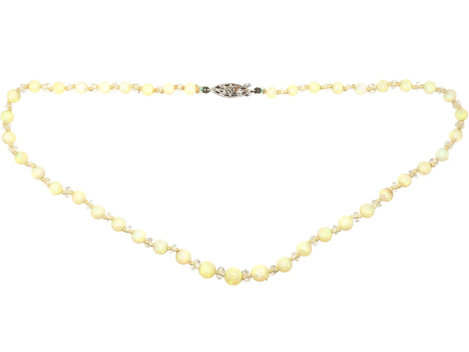 A well matched necklace of opalOpals occur in a range of body colours from white, black or grey, bright orangey red and a pale watery colour. The most precious opals show strong colour contrast and generally have a dark body colour with a vivid array of colour play. beads with rock crystal rondels in between. The opals display vivid flashes of mainly green and blue with red undertones. The later 9ct37.5% pure gold (or 375 parts pure gold and 625 parts other metals) white goldWhite gold is an alloy of gold and at least one other white metal – most often nickel or palladium (both of which act as a bleaching agent to reduce the natural yellow colour of the gold). clasp has been set with a tiny rose diamondA precious, lustrous gemstone made of highly compressed carbon. Diamonds are one of the hardest materials known to mankind. Colours of diamonds range from colourless, yellow, orange and brown to almost black. Natural coloured (or ‘fancy’) diamonds can be extremely rare. The cut, colour, clarity and carat weight of a diamond are the criteria jewellers use…. A lovely necklace to wear for any occasion