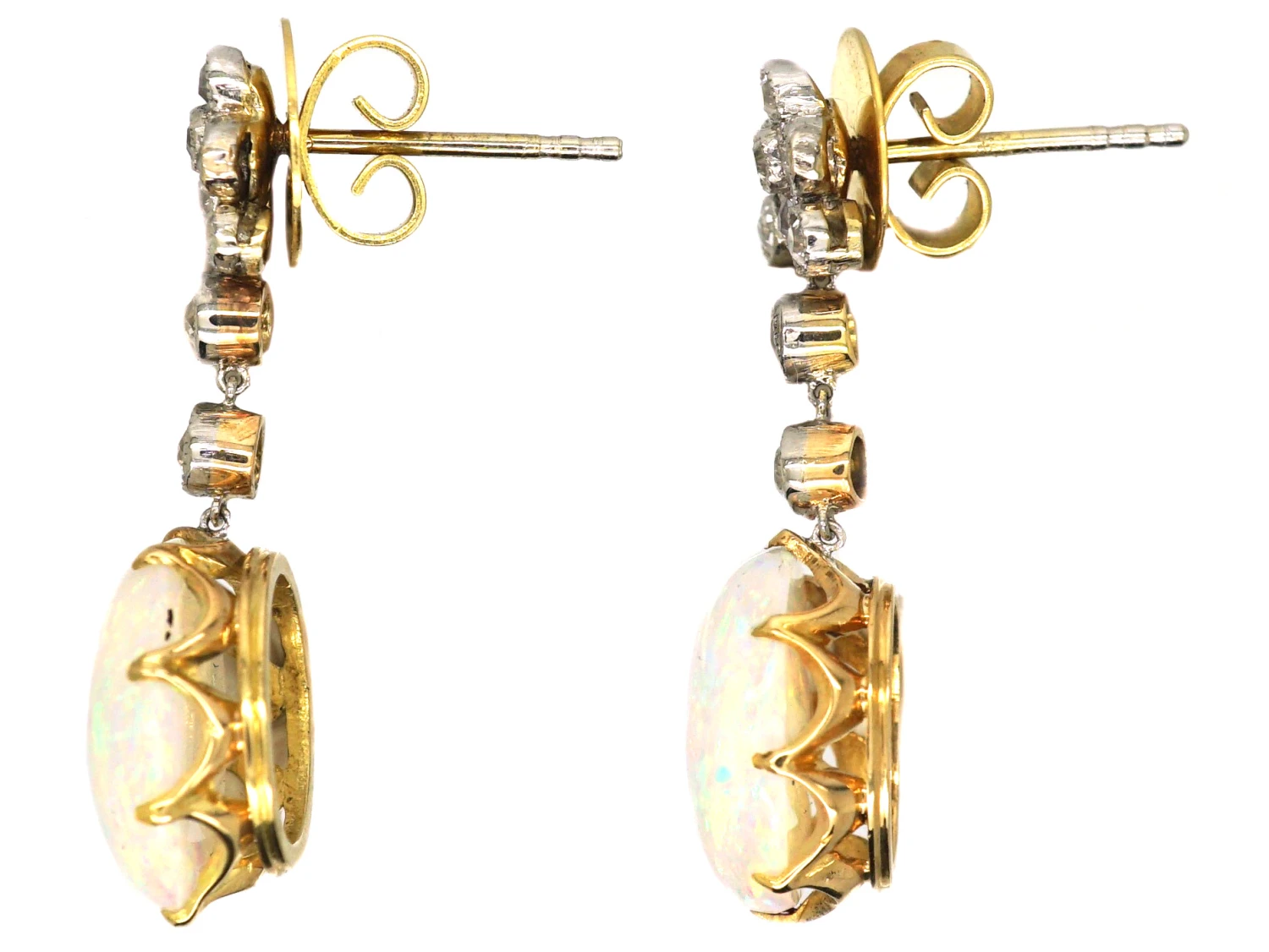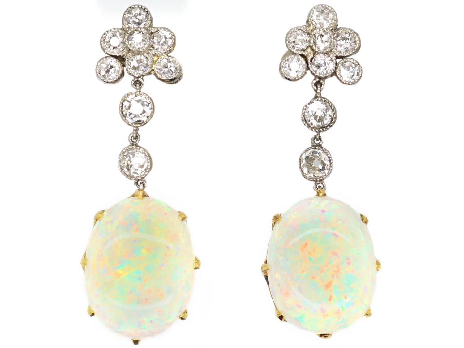 A beautiful pair of opalOpals occur in a range of body colours from white, black or grey, bright orangey red and a pale watery colour. The most precious opals show strong colour contrast and generally have a dark body colour with a vivid array of colour play. and diamondA precious, lustrous gemstone made of highly compressed carbon. Diamonds are one of the hardest materials known to mankind. Colours of diamonds range from colourless, yellow, orange and brown to almost black. Natural coloured (or ‘fancy’) diamonds can be extremely rare. The cut, colour, clarity and carat weight of a diamond are the criteria jewellers use… earrings that were made circa 1910-1920. Each earring has been clawA precious metal prong used to hold a gemstone in place. set with a large opal that has an approximate weight of 2.12 caratsThe unit of weight for a diamond or other gemstone and also for a pearl. Abbreviated ‘ct’, 1 carat is equal to 0.2 grams. In reference to gold, a unit of purity or fineness of gold and gold alloy, expressed as a number out of 24 parts by weight, e.g. ’24 carat’ signifies pure gold, ’18 carat’ 18/24th gold in the alloy, et cetera. Also abbreviated as ‘c…. They are well matched stones and display a myriad of blues, greens and reds. They are complimented by old mine cutAn 18th, 19th and early 20th century diamond shape, typically cushion or asymmetrical, marked by a small table, a high crown and a large culet. Culets are the small flat facets at the bottom of a stone which appear to the untrained eye as a hole in the middle of the stone. Before the advent of modern machinery which allows for the precise faceting we see tod… diamonds above in a flower design. They are 15ct62.5% pure gold (or 625 parts pure gold and 375 parts other metals). Popular during the Victorian, Edwardian and Art Deco eras but was discontinued in the mid-1930s. gold with platinumDerives from the Spanish word ‘platina’ meaning ‘little silver’. Acknowledged since the 1900s, platinum’s durability and natural brightness has been and still is today highly treasured A metallic element prized for its rarity, whiteness, high tensile strength and insusceptibility to corrosion, platinum first became widely used in jewellery in the late ninete… and millegrainA tiny decorative feature – normally in platiunum – in which minute beads of metal are raised along the edge of a setting, which adds texture and enhances the sparkling effect. detail around the diamonds.