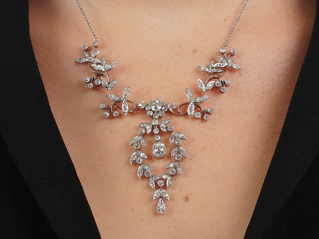 A really wonderful platinumDerives from the Spanish word ‘platina’ meaning ‘little silver’. Acknowledged since the 1900s, platinum’s durability and natural brightness has been and still is today highly treasured A metallic element prized for its rarity, whiteness, high tensile strength and insusceptibility to corrosion, platinum first became widely used in jewellery in the late ninete… and 15ct62.5% pure gold (or 625 parts pure gold and 375 parts other metals). Popular during the Victorian, Edwardian and Art Deco eras but was discontinued in the mid-1930s. gold necklace set with good well matched graded white diamonds, the largest of which is a caratThe unit of weight for a diamond or other gemstone and also for a pearl. Abbreviated ‘ct’, 1 carat is equal to 0.2 grams. In reference to gold, a unit of purity or fineness of gold and gold alloy, expressed as a number out of 24 parts by weight, e.g. ’24 carat’ signifies pure gold, ’18 carat’ 18/24th gold in the alloy, et cetera. Also abbreviated as ‘c…. The total weight is approximately 5.20 caratsThe unit of weight for a diamond or other gemstone and also for a pearl. Abbreviated ‘ct’, 1 carat is equal to 0.2 grams. In reference to gold, a unit of purity or fineness of gold and gold alloy, expressed as a number out of 24 parts by weight, e.g. ’24 carat’ signifies pure gold, ’18 carat’ 18/24th gold in the alloy, et cetera. Also abbreviated as ‘c…. It was made in the EdwardianJewellery made in the Edwardian era (1901-1914). period, circa 1900-1914 and is typical of the style from that era with flower and leaf motifs. Platinum is a very strong metal so it can be used sparingly unlike earlier silverA metallic element which is malleable and ductile, and white in colour, making it ideal for use in jewellery. It is usually mixed with copper to improve its hardness.