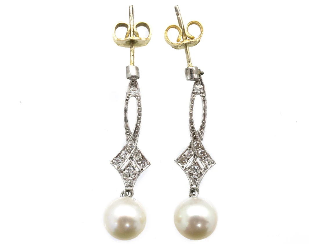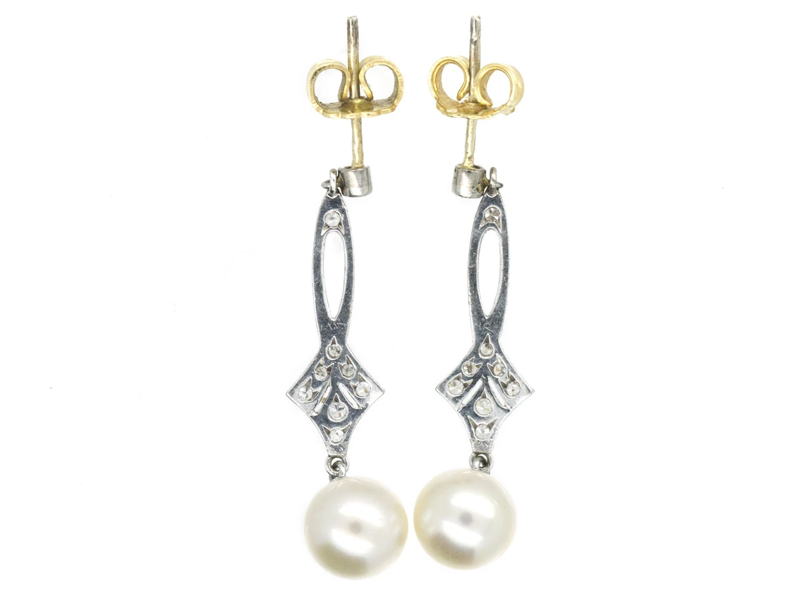 A beautiful pair of diamondA precious, lustrous gemstone made of highly compressed carbon. Diamonds are one of the hardest materials known to mankind. Colours of diamonds range from colourless, yellow, orange and brown to almost black. Natural coloured (or ‘fancy’) diamonds can be extremely rare. The cut, colour, clarity and carat weight of a diamond are the criteria jewellers use… and pearlNatural pearls are an organic gem formed inside live mollusc shells and come in all shapes and sizes. They are formed as the result of a natural irritant within the mollusc’s mantle and as a defence, layers of iridescent nacre form over the top of it, creating a pearl. drop earrings that were made in the EdwardianJewellery made in the Edwardian era (1901-1914). era, circa 1900-1910. The diamonds are set in to a platinumDerives from the Spanish word ‘platina’ meaning ‘little silver’. Acknowledged since the 1900s, platinum’s durability and natural brightness has been and still is today highly treasured A metallic element prized for its rarity, whiteness, high tensile strength and insusceptibility to corrosion, platinum first became widely used in jewellery in the late ninete… twist design. They are light and very pretty on the ear.