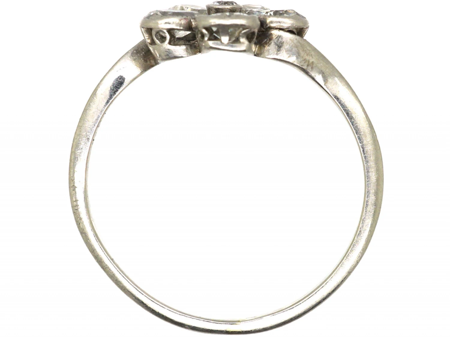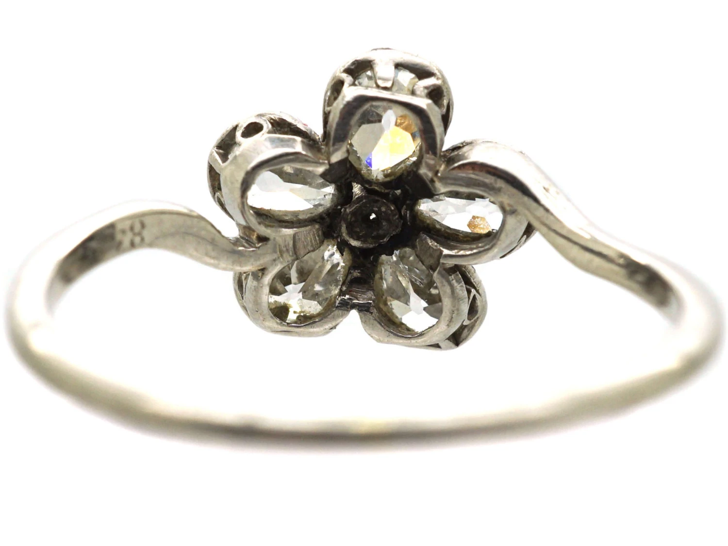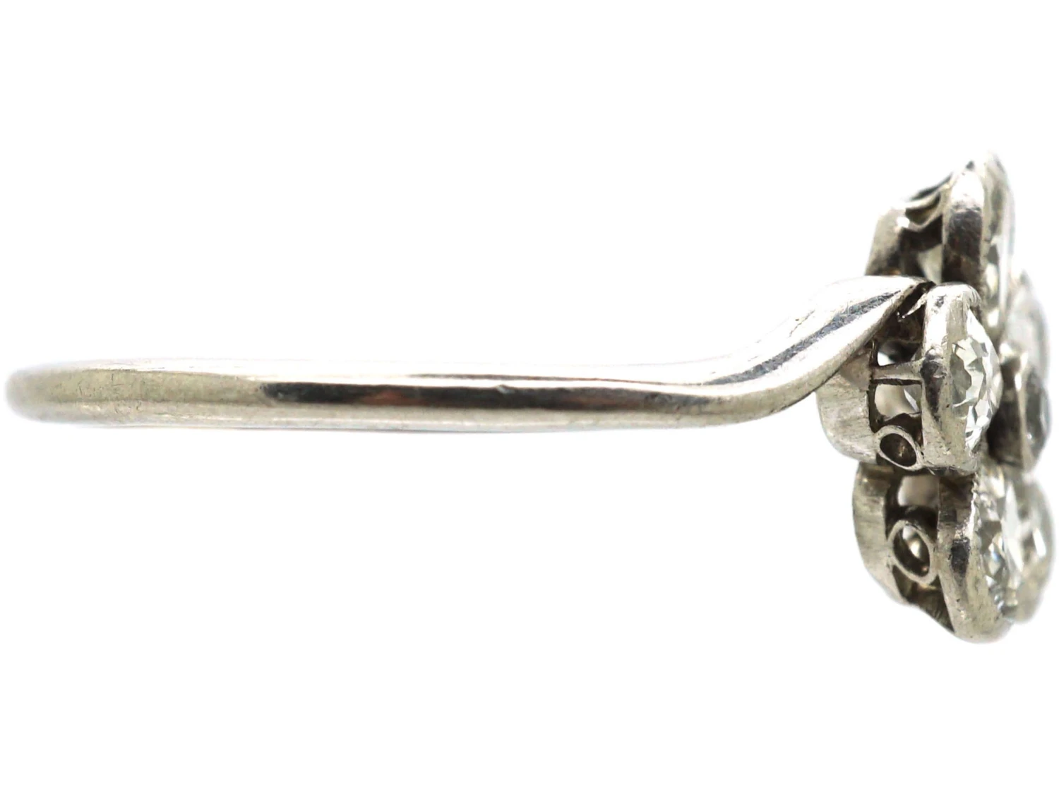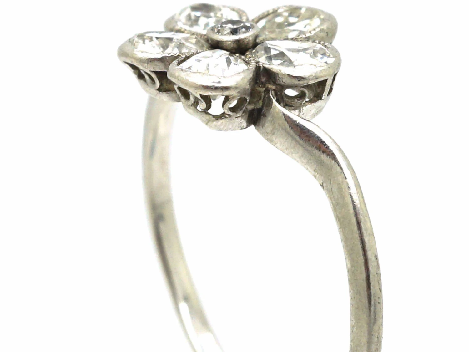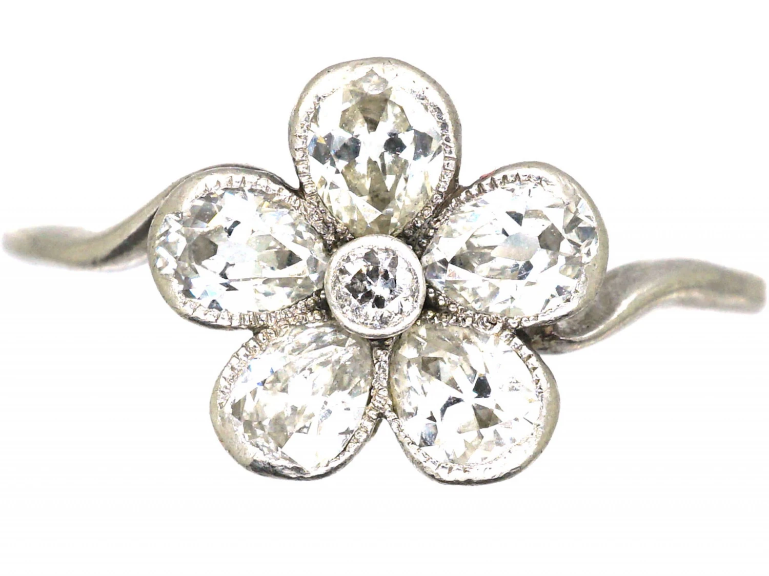 This ring is to die for! It is platinumDerives from the Spanish word ‘platina’ meaning ‘little silver’. Acknowledged since the 1900s, platinum’s durability and natural brightness has been and still is today highly treasured A metallic element prized for its rarity, whiteness, high tensile strength and insusceptibility to corrosion, platinum first became widely used in jewellery in the late ninete… and has been bezelA metal rim which holds the stone in a piece of jewellery. This metal band has its top edges smoothed over to better hold the stone in place. and millegrainA tiny decorative feature – normally in platiunum – in which minute beads of metal are raised along the edge of a setting, which adds texture and enhances the sparkling effect. set with five pear shaped diamonds with a small diamondA precious, lustrous gemstone made of highly compressed carbon. Diamonds are one of the hardest materials known to mankind. Colours of diamonds range from colourless, yellow, orange and brown to almost black. Natural coloured (or ‘fancy’) diamonds can be extremely rare. The cut, colour, clarity and carat weight of a diamond are the criteria jewellers use… in the centre in a pansy shape. The pansy traditionally in antiqueFrom the Latin ‘antiquus’, meaning ‘old and long in existence’, it is generally used to refer to collectible artifacts of at least 100 years of age.