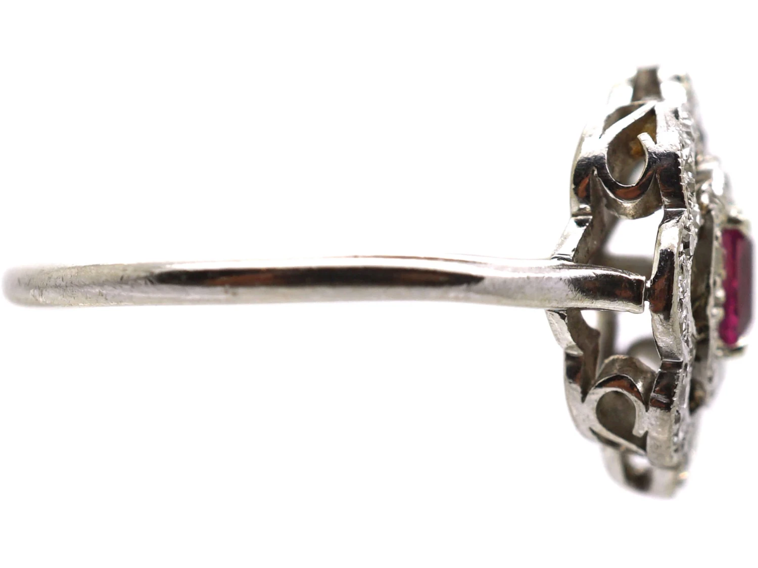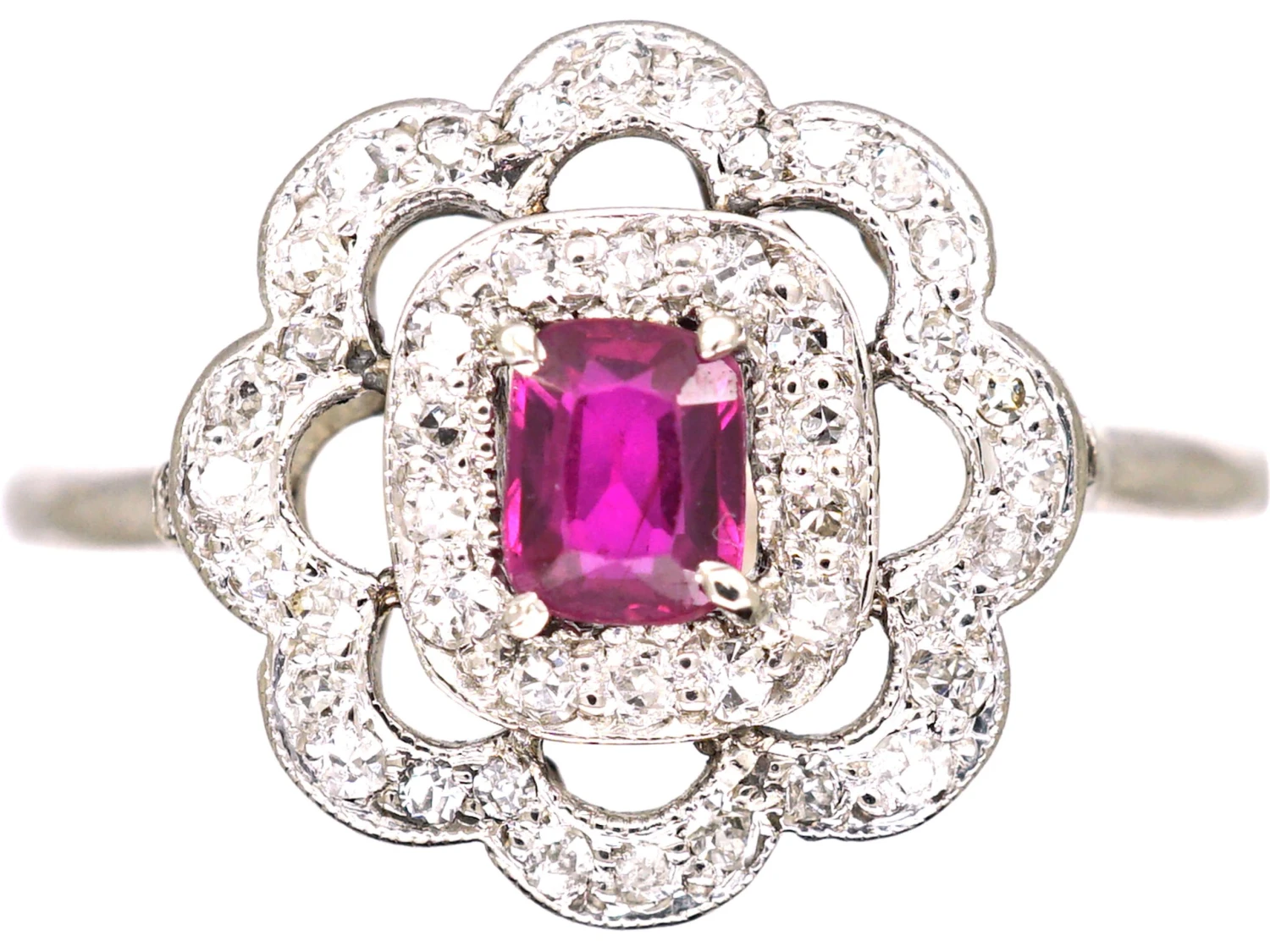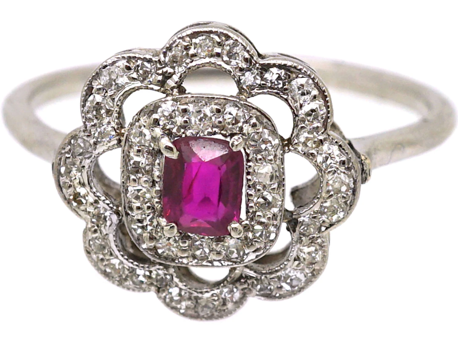 This is a particularly pretty platinumDerives from the Spanish word ‘platina’ meaning ‘little silver’. Acknowledged since the 1900s, platinum’s durability and natural brightness has been and still is today highly treasured A metallic element prized for its rarity, whiteness, high tensile strength and insusceptibility to corrosion, platinum first became widely used in jewellery in the late ninete… ring that was made circa 1910. It has been clawA precious metal prong used to hold a gemstone in place. set with a pretty pinkish red rubyOne of the most valuable gemstones on earth. From the corundum family, the red variety being ruby and the blue, sapphire. With the exception of the diamond, corundum is the hardest of the gemstones on the Mohs scale scoring a 9.. Around it are claw set small diamonds then a pretty pierced work scalloped surround set with more diamonds.