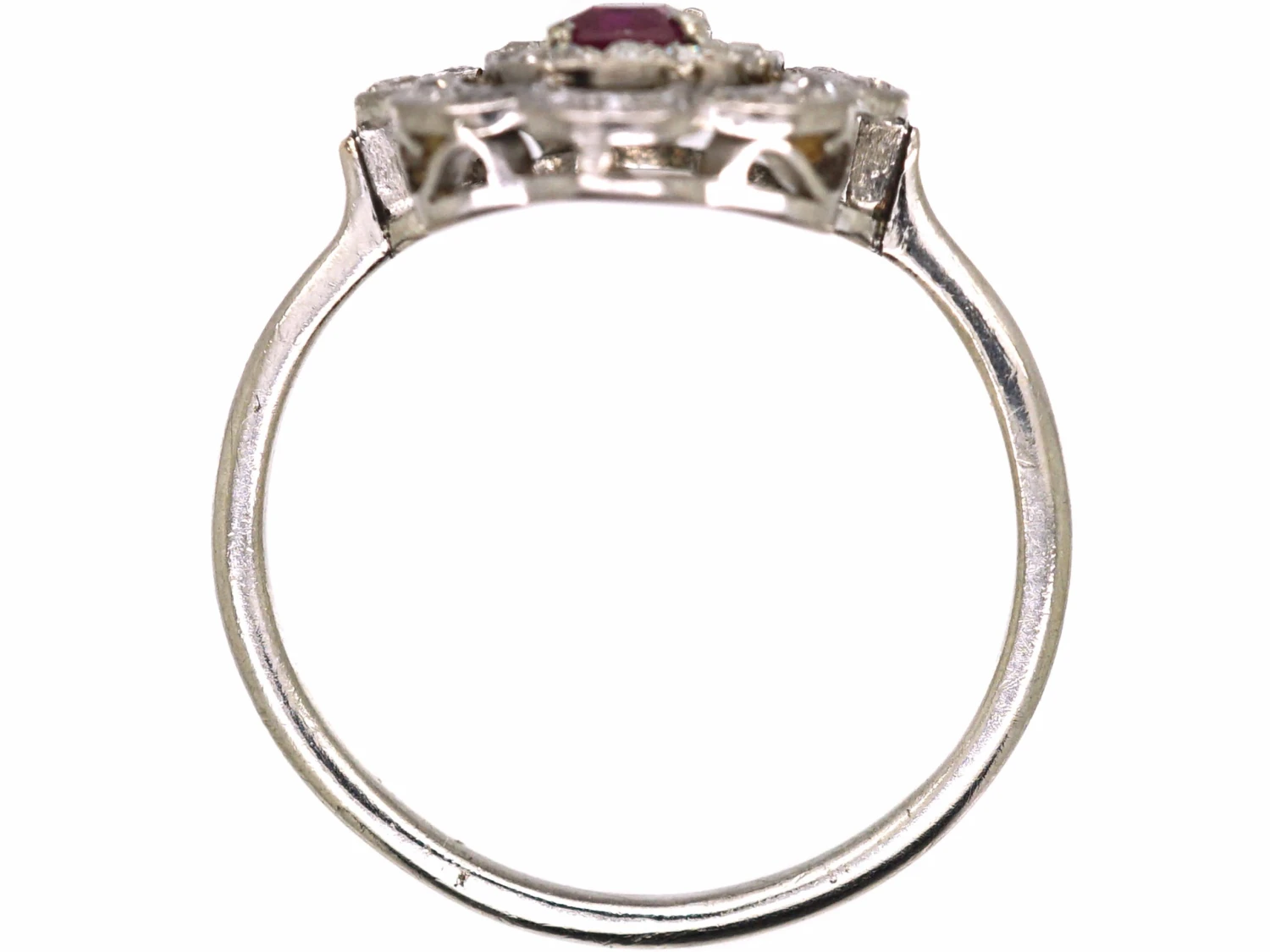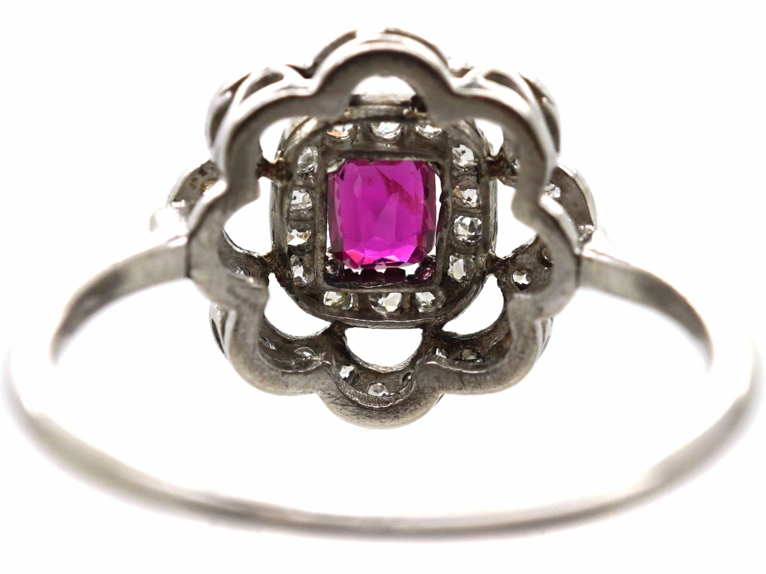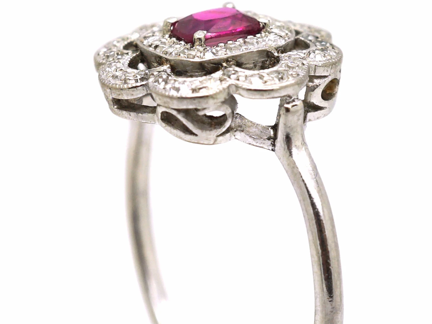 This is a particularly pretty platinumDerives from the Spanish word ‘platina’ meaning ‘little silver’. Acknowledged since the 1900s, platinum’s durability and natural brightness has been and still is today highly treasured A metallic element prized for its rarity, whiteness, high tensile strength and insusceptibility to corrosion, platinum first became widely used in jewellery in the late ninete… ring that was made circa 1910. It has been clawA precious metal prong used to hold a gemstone in place. set with a pretty pinkish red rubyOne of the most valuable gemstones on earth. From the corundum family, the red variety being ruby and the blue, sapphire. With the exception of the diamond, corundum is the hardest of the gemstones on the Mohs scale scoring a 9.. Around it are claw set small diamonds then a pretty pierced work scalloped surround set with more diamonds.