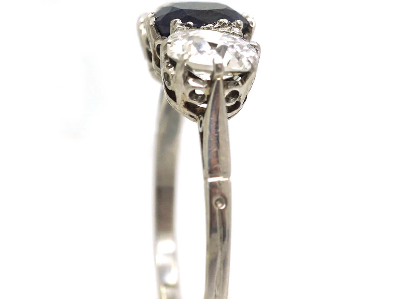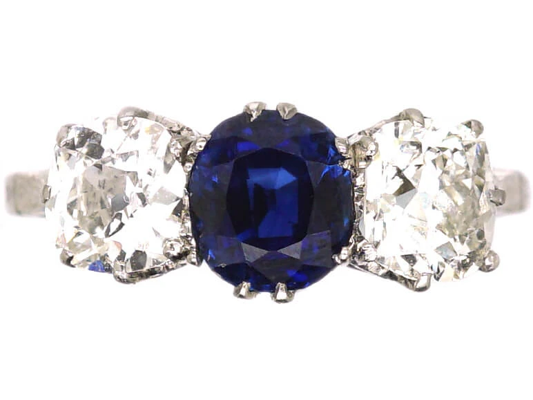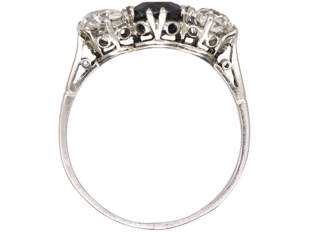 A classic platinum three stone sapphire and diamond ring that was made circa 1915. The double claw set sapphire is a wonderful royal blue colour. On either side is a claw set old mine cut diamond. They are well matched, bright white stones. It would make a perfect engagement ring.