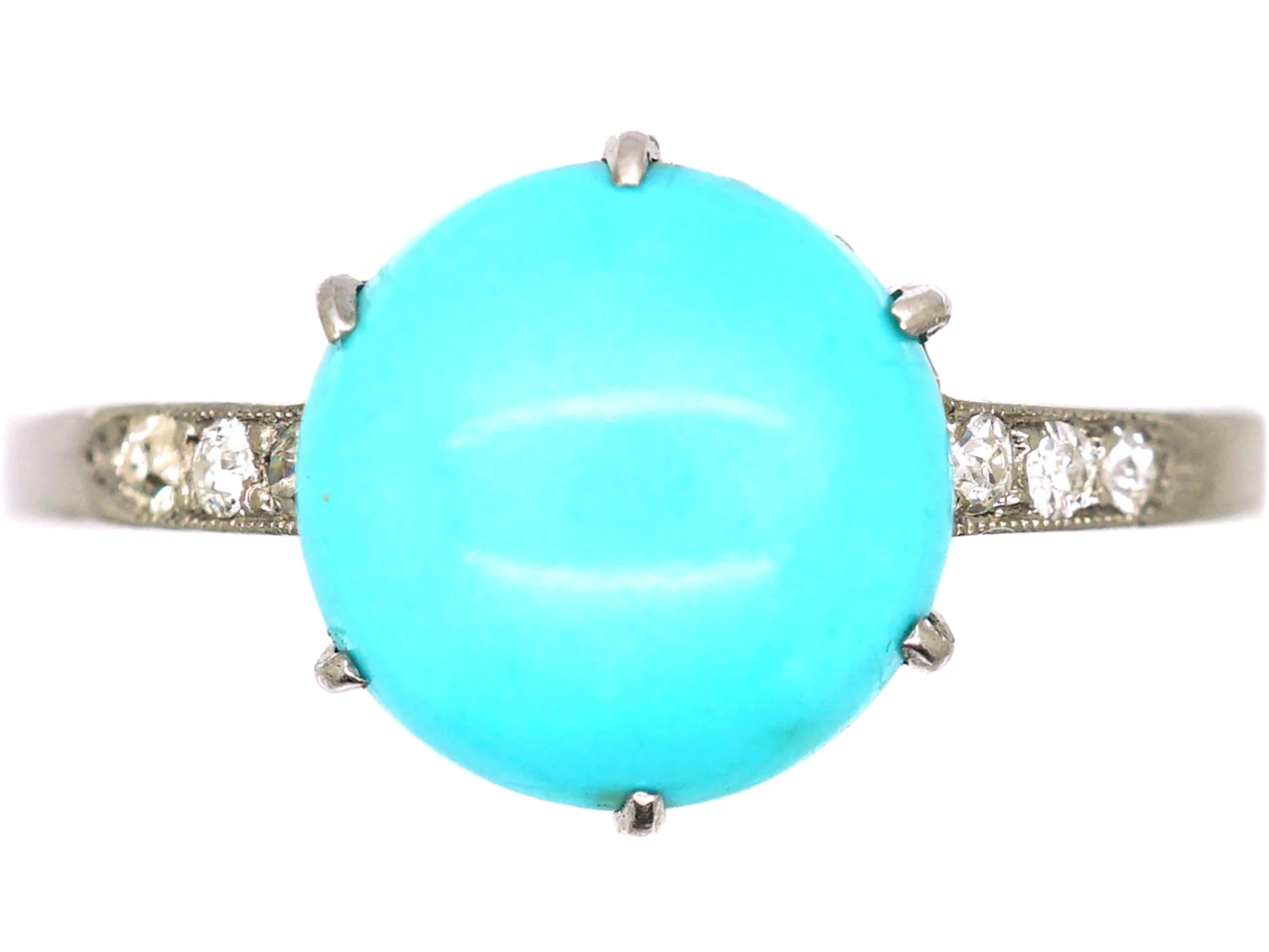 An unusual platinumDerives from the Spanish word ‘platina’ meaning ‘little silver’. Acknowledged since the 1900s, platinum’s durability and natural brightness has been and still is today highly treasured A metallic element prized for its rarity, whiteness, high tensile strength and insusceptibility to corrosion, platinum first became widely used in jewellery in the late ninete… ring that was made circa 1910-1920 and has been clawA precious metal prong used to hold a gemstone in place. set with a lovely turquoiseTurquoise is an opaque gem and is often formed in what is called matrix, a black or brown veining derived from the host rock in which the gem forms. In fine jewellery, unblemished sky blue turquoise is the ideal, although regularly patterned matrix turquoise is also sought-after.. On either side there are three small diamonds set in to the shouldersThe point on a ring where the central section meets the shank or band, often carved, decorated or inlaid with small diamond accent stones. and there is an added surprise. Around the girdle of the turquoise are a further eight small diamonds in rub over settings. Turquoise traditionally means “Forget me not” after the turquoise coloured flower of the same name, so perhaps this ring would have originally been a gift of love.
