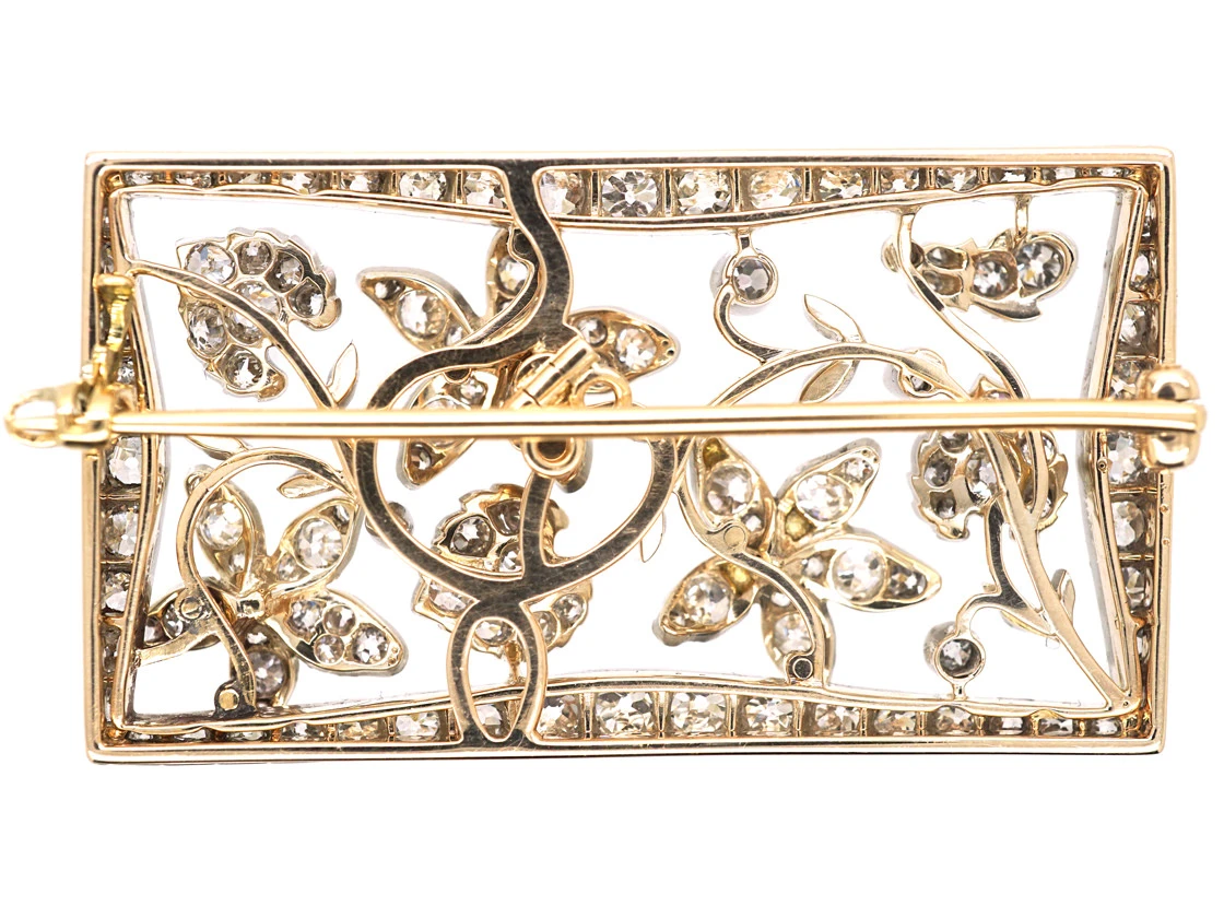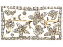 A most unusual 15ct62.5% pure gold (or 625 parts pure gold and 375 parts other metals). Popular during the Victorian, Edwardian and Art Deco eras but was discontinued in the mid-1930s. gold brooch set with well matched white graded old mine cutAn 18th, 19th and early 20th century diamond shape, typically cushion or asymmetrical, marked by a small table, a high crown and a large culet. Culets are the small flat facets at the bottom of a stone which appear to the untrained eye as a hole in the middle of the stone. Before the advent of modern machinery which allows for the precise faceting we see tod… diamonds in a wonderful design of flowers, leaves and buds. It is in it’s original case and was retailed by W Bruford and Son who were based in Eastbourne and Exeter and were a well known firm of jewellers. It has been so beautifully made. There is a screw fitting on the back which when undone separates the whole brooch mounting from the plaque. I assume that this could then have been attached to either a tiara or a choker.