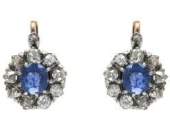 A really pretty pair of earrings which have been set with well matched CeylonSri Lankan (Ceylon was the country’s former name until 1972) sapphires surrounded with old cutOld Cut (or Old European Cut) diamonds are characterised by a symmetrical rounded outline, and a deep crown and pavilion (the top and bottom sections of a brilliant cut stone when viewed in profile). diamonds. A small diamondA precious, lustrous gemstone made of highly compressed carbon. Diamonds are one of the hardest materials known to mankind. Colours of diamonds range from colourless, yellow, orange and brown to almost black. Natural coloured (or ‘fancy’) diamonds can be extremely rare. The cut, colour, clarity and carat weight of a diamond are the criteria jewellers use… on the top completes the look. They were made circa 1910.