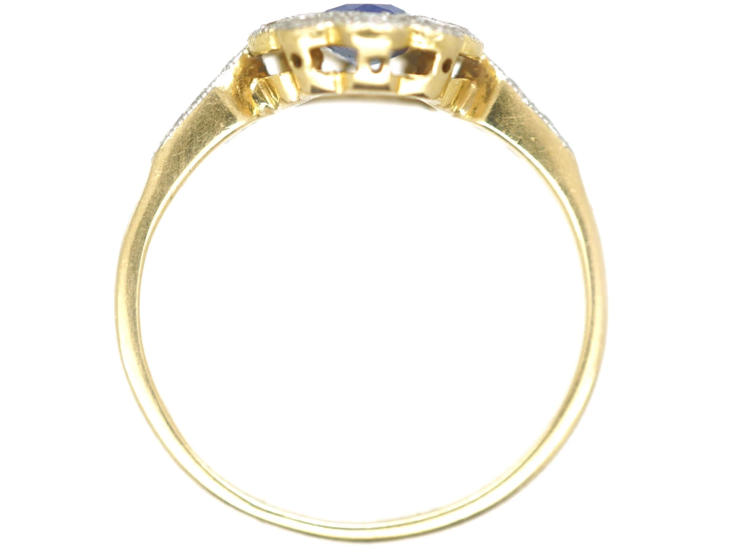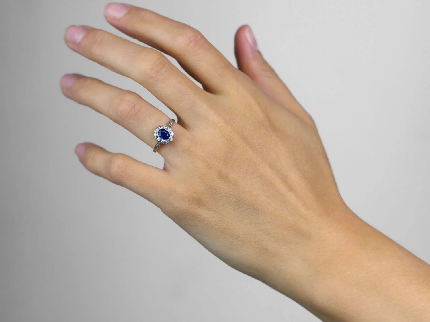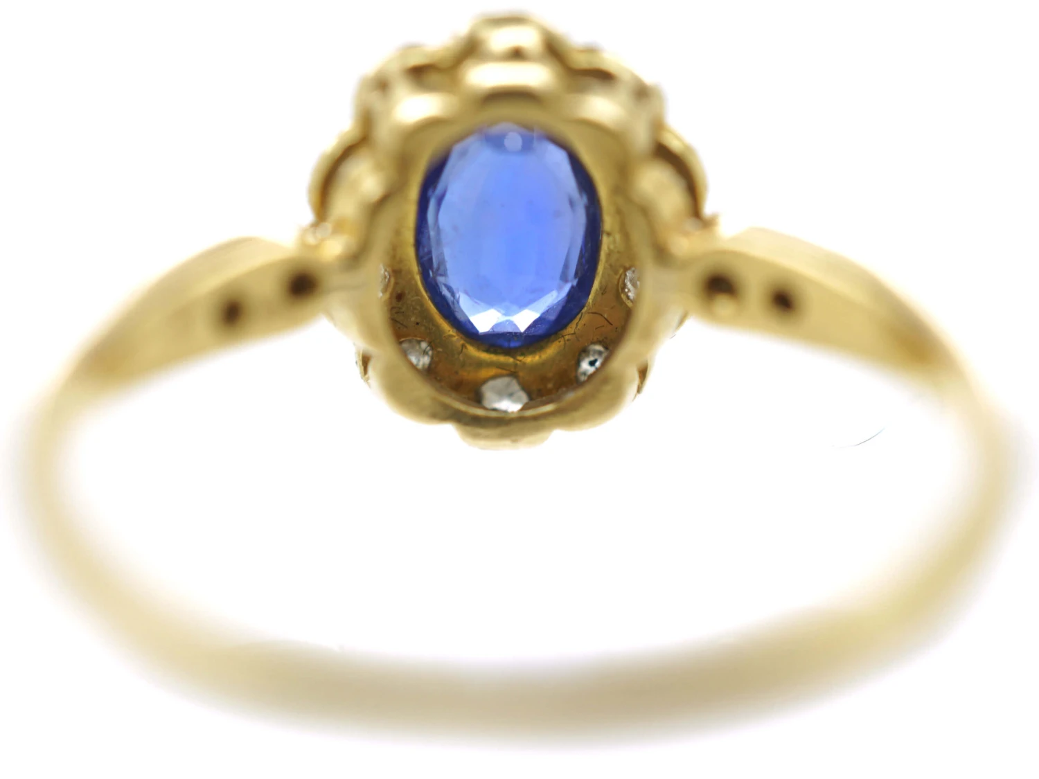 A lovely 18ct75% pure gold (or 750 parts pure gold and 250 parts other metals) gold ring with a platinumDerives from the Spanish word ‘platina’ meaning ‘little silver’. Acknowledged since the 1900s, platinum’s durability and natural brightness has been and still is today highly treasured A metallic element prized for its rarity, whiteness, high tensile strength and insusceptibility to corrosion, platinum first became widely used in jewellery in the late ninete… top that was made circa 1910. It has ben set with a good naturalA natural stone is called such because it has not been subjected to any treatments. mid to deep blue oval sapphireBlue is the best-known colour for this gemstone but it can be found in all colours of the spectrum. After diamond, sapphire is the hardest gemstone.