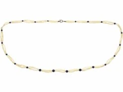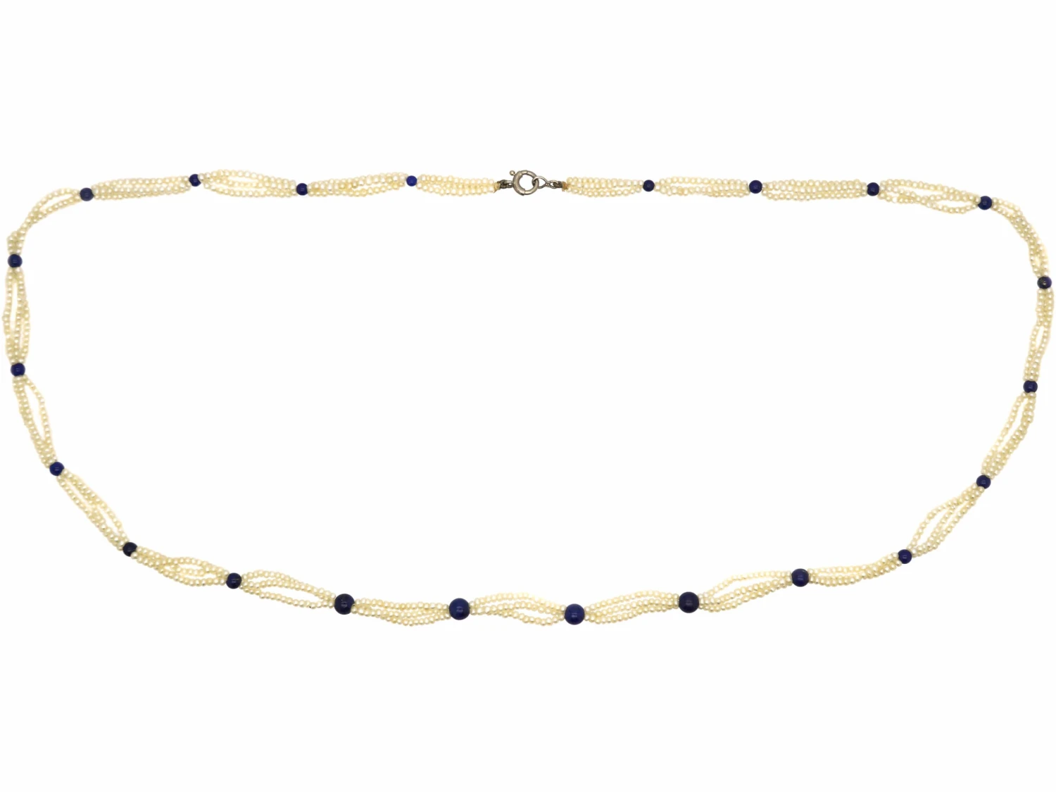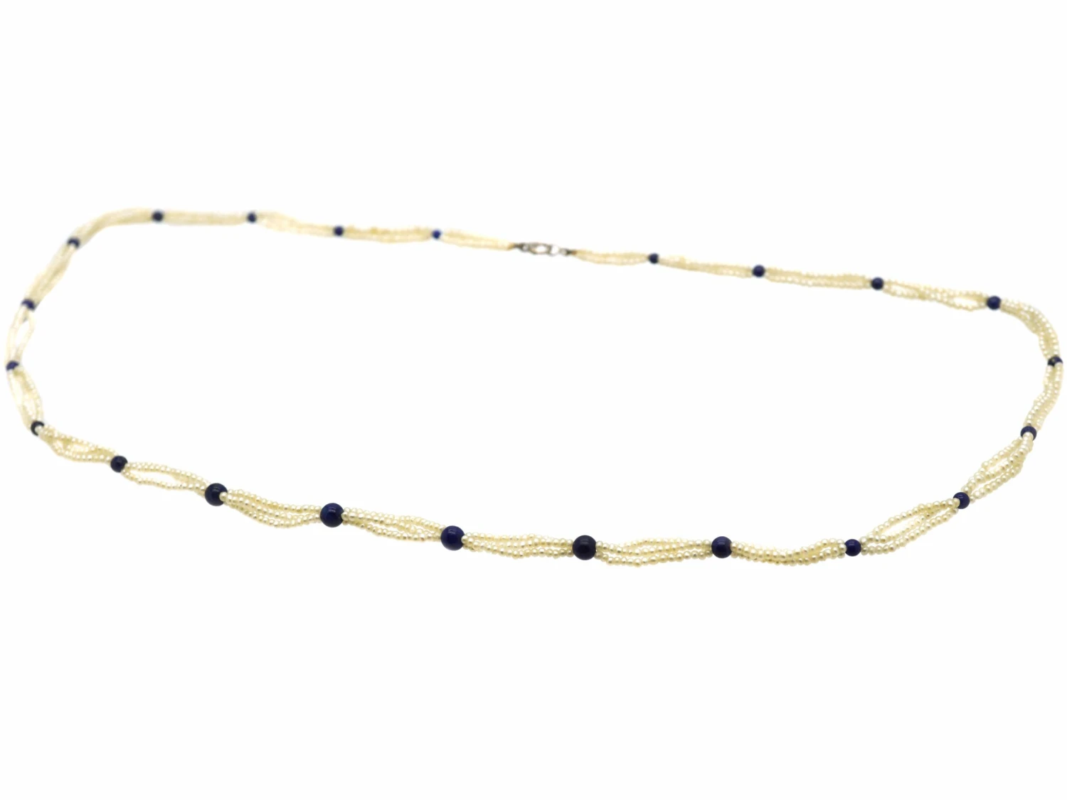 A pretty necklace that was made in the early 20th century. It is composed of three strands of seed pearls interspersed with lapis beads. The clasp is 18ct75% pure gold (or 750 parts pure gold and 250 parts other metals) white goldWhite gold is an alloy of gold and at least one other white metal – most often nickel or palladium (both of which act as a bleaching agent to reduce the natural yellow colour of the gold)..