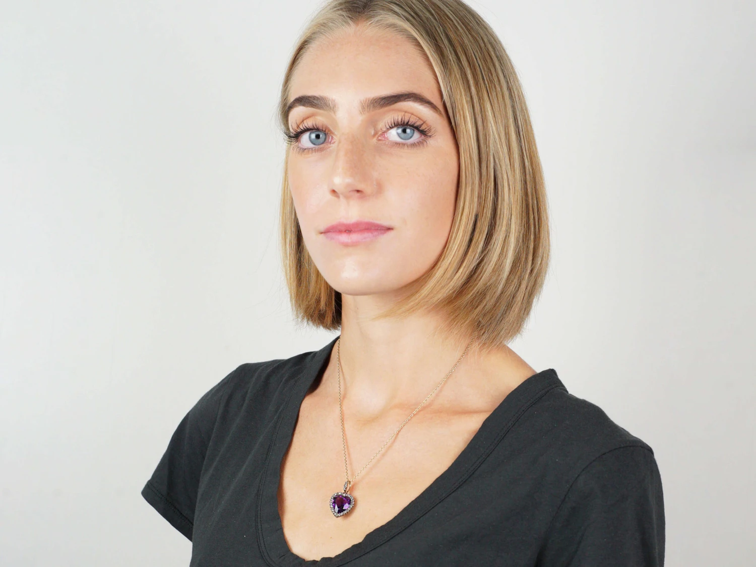 A very pretty 15ct62.5% pure gold (or 625 parts pure gold and 375 parts other metals). Popular during the Victorian, Edwardian and Art Deco eras but was discontinued in the mid-1930s. gold heart shape pendant which is set with a very good Siberian amethystAmethyst is the purple variety of macrocrystalline quartz. From the Greek amethystos meaning ‘a remedy against drunkedness’, it was believed to prevent intoxication and ensure the wearer retains a clear head and quick wit. It was once considered as valuable as ruby, sapphire and emerald. surrounded by rose cutThe ârose cutâ, defined by its rounded outline and multiple triangular facets, is one of the earliest diamond cuts, with its origins in sixteenth century Europe. A rose cut typically has a flat base and anywhere from six to twenty four facets, the latter known as a full rose cut. diamonds. It was made circa 1910 and would be ideal as a loverâs gift.