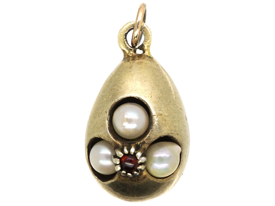An interesting egg shaped pendant set with three pearls and a small cabochonA polished, not faceted, dome shaped stone – either round or oval with a flat polished base, primarily used as a cut for phenomenal stones such as cat’s eyes and stars.
