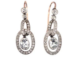 & gold earrings. They are set with graded pasteGlass made to resemble gem materials, which may be moulded, faceted, carved, etc. and look so like their real counterpart diamonds! The pastes are millegrainA tiny decorative feature – normally in platiunum – in which minute beads of metal are raised along the edge of a setting, which adds texture and enhances the sparkling effect. set, a sign of real quality. They were made circa 1900-1910 and are in great condition.